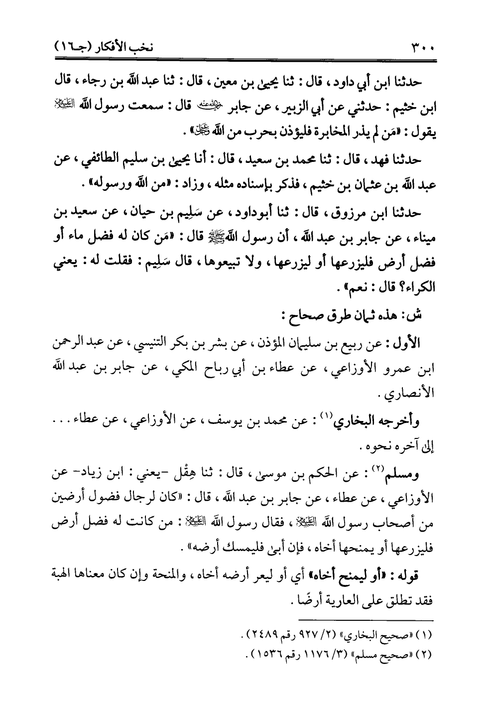 ومسلم (¬2): عن الحكم بن موسى، قال: ثنا هِقْل -يعني: ابن زياد- عن الأوزاعي، عن عطاء، عن جابر بن عبد الله، قال: "كان لرجال فضول أرضين من أصحاب رسول الله -عليه السلام-، فقال رسول الله -عليه السلام-: من كانت له فضل أرض فليزرعها أو يمنحها أخاه، فإن أبى فليمسك أرضه".