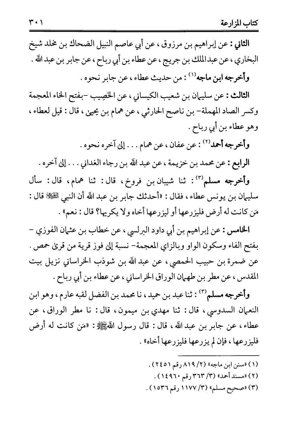 وأخرجه مسلم (3): ثنا عبد بن حميد، نا محمد بن الفضل لقبه عارم، وهو ابن النعمان السدوسي، قال: ثنا مهدي بن ميمون، قال: نا مطر الوراق، عن عطاء، عن جابر بن عبد الله، قال: قال رسول الله - صلى الله عليه وسلم -: "مَن كانت له أرض فليزرعها، فإن لم يزرعها فليزرعها أخاه".