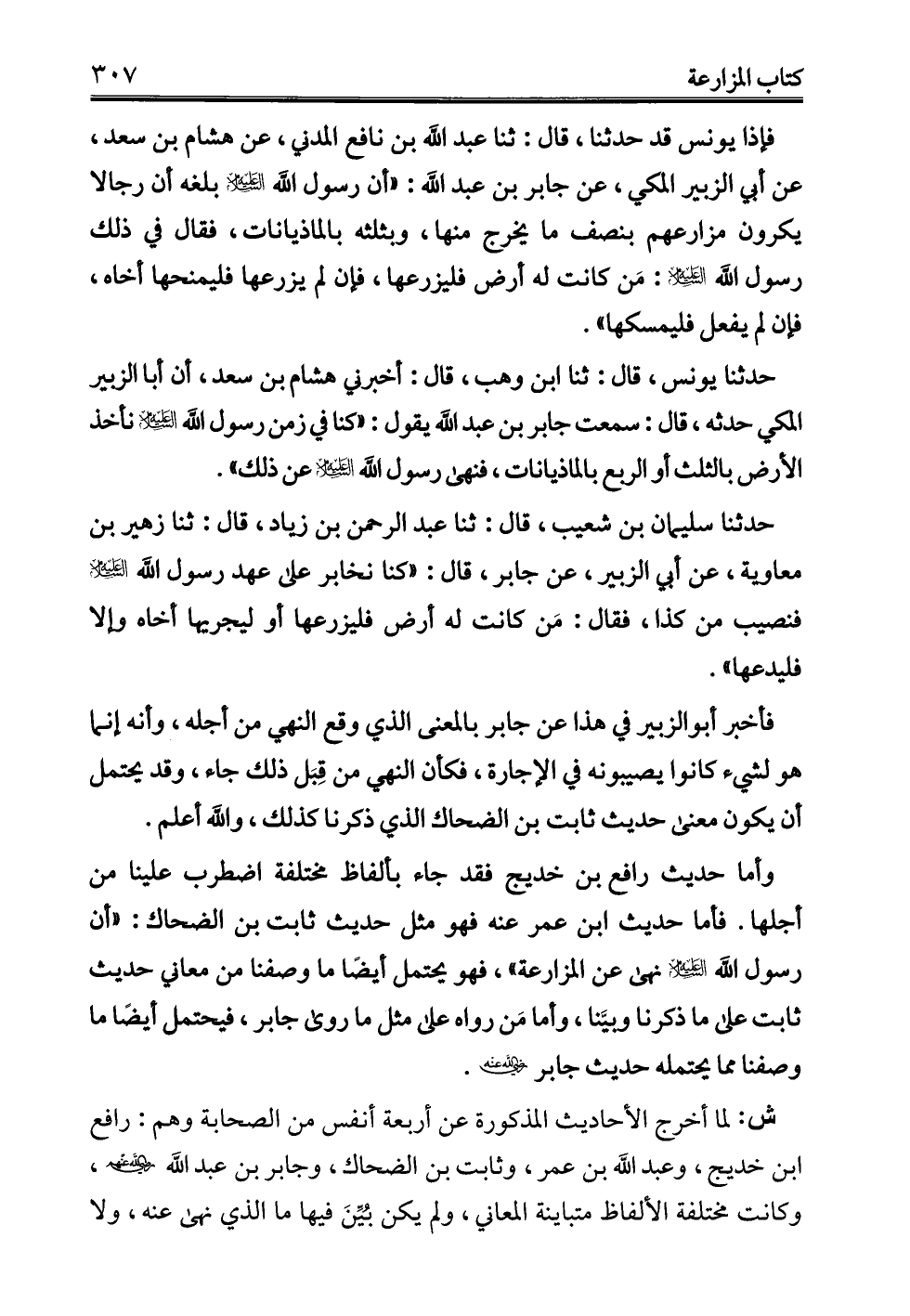 ش: لما أخرج الأحاديث المذكورة عن أربعة أنفس من الصحابة وهم: رافع بن خديج، وعبد الله بن عمر، وثابت بن الضحاك، وجابر بن عبد الله - رضي الله عنهم -، وكانت مختلفة الألفاظ متباينة المعاني، ولم يكن بُيِّنَ فيها ما الذي نهى عنه، ولا