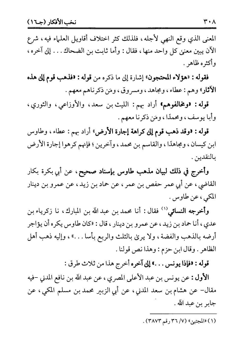 وأخرجه النسائي (¬1) فقال: أنا محمد بن عبد الله بن المبارك، نا زكرياء بن عدي، أنا حماد بن زيد، عن عمرو بن دينار، قال: "كان طاوس يكره أن يؤاجر أرضه بالذهب والفضة، ولا يرى بالثلث والربع بأسا. . . ."، وإليه ذهب أهل الظاهر. وقال ابن حزم: وهذا نص قولنا.