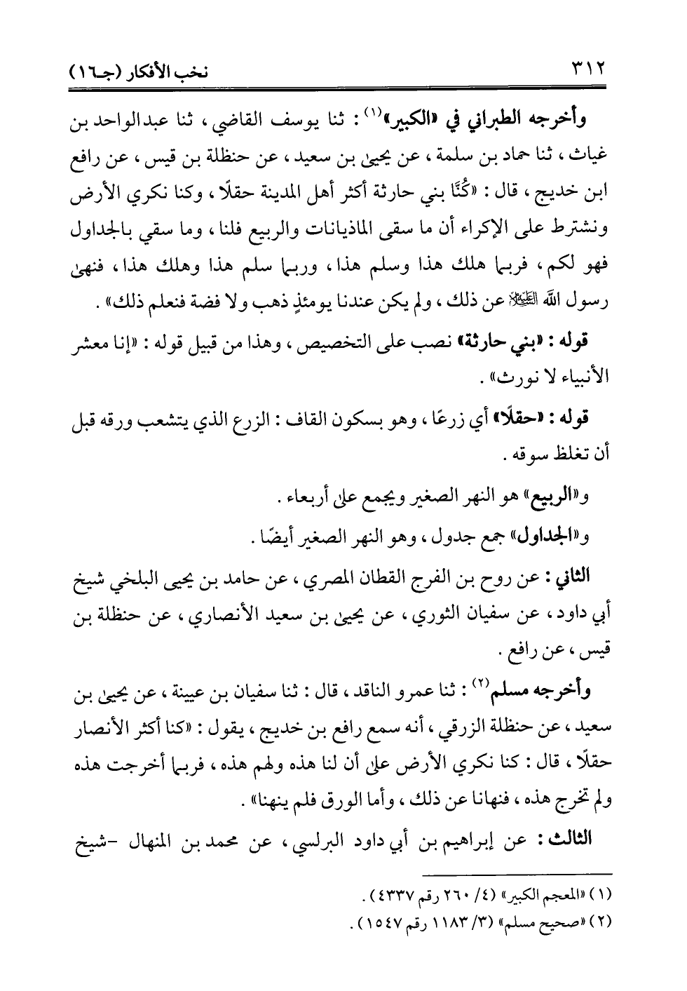 وأخرجه الطبراني في "الكبير" (¬1): ثنا يوسف القاضي، ثنا عبد الواحد بن غياث، ثنا حماد بن سلمة، عن يحيى بن سعيد، عن حنظلة بن قيس، عن رافع بن خديج، قال: "كُنَّا بني حارثة أكثر أهل المدينة حقلًا، وكنا نكري الأرض ونشترط على الإكراء أن ما سقى الماذيانات والربيع فلنا، وما سقي بالجداول فهو لكم، فربما هلك هذا وسلم هذا، وربما سلم هذا وهلك هذا، فنهى رسول الله -عليه السلام- عن ذلك، ولم يكن عندنا يومئذٍ ذهب ولا فضة فنعلم ذلك".