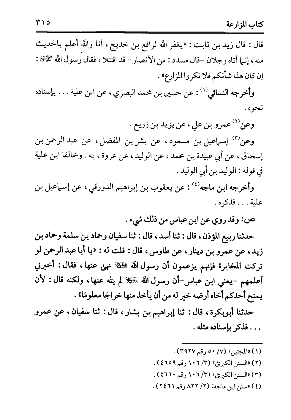 حدثنا ربيع المؤذن، قال: ثنا أسد، قال: ثنا سفيان وحماد بن سلمة وحماد بن زيد، عن عمرو بن دينار، عن طاوس، قال: قلت له: "يا أبا عبد الرحمن لو تركت المخابرة فإنهم يزعمون أن رسول الله -عليه السلام- نهى عنها، فقال: أخبرني أعلمهم -يعني ابن عباس- أن رسول الله -عليه السلام- لم يَنْه عنها، ولكنه قال: لأن يمنح أحدكم أخاه أرضه خير له من أن يأخذ منها خراجًا معلومًا".