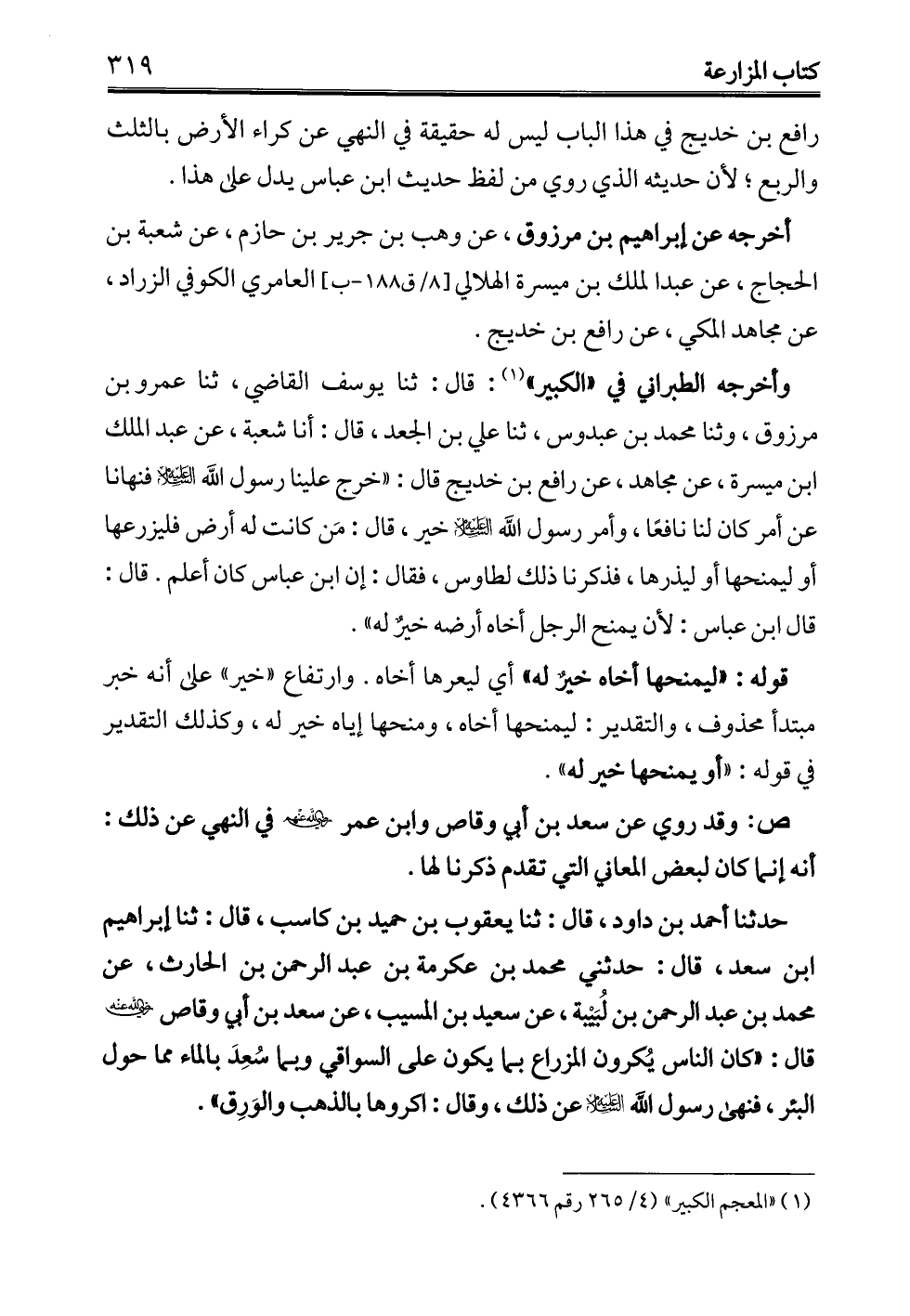 حدثنا أحمد بن داود، قال: ثنا يعقوب بن حميد بن كاسب، قال: ثنا إبراهيم بن سعد، قال: حدثني محمد بن عكرمة بن عبد الرحمن بن الحارث، عن محمد بن عبد الرحمن بن لُبَيْبة، عن سعيد بن المسيب، عن سعد بن أبي وقاص - رضي الله عنه - قال: "كان الناس يُكرون المزارع بما يكون على السواقي وبما سُعِدَ بالماء مما حول البئر، فنهى رسول الله -عليه السلام- عن ذلك، وقال: اكروها بالذهب والوَرِق".