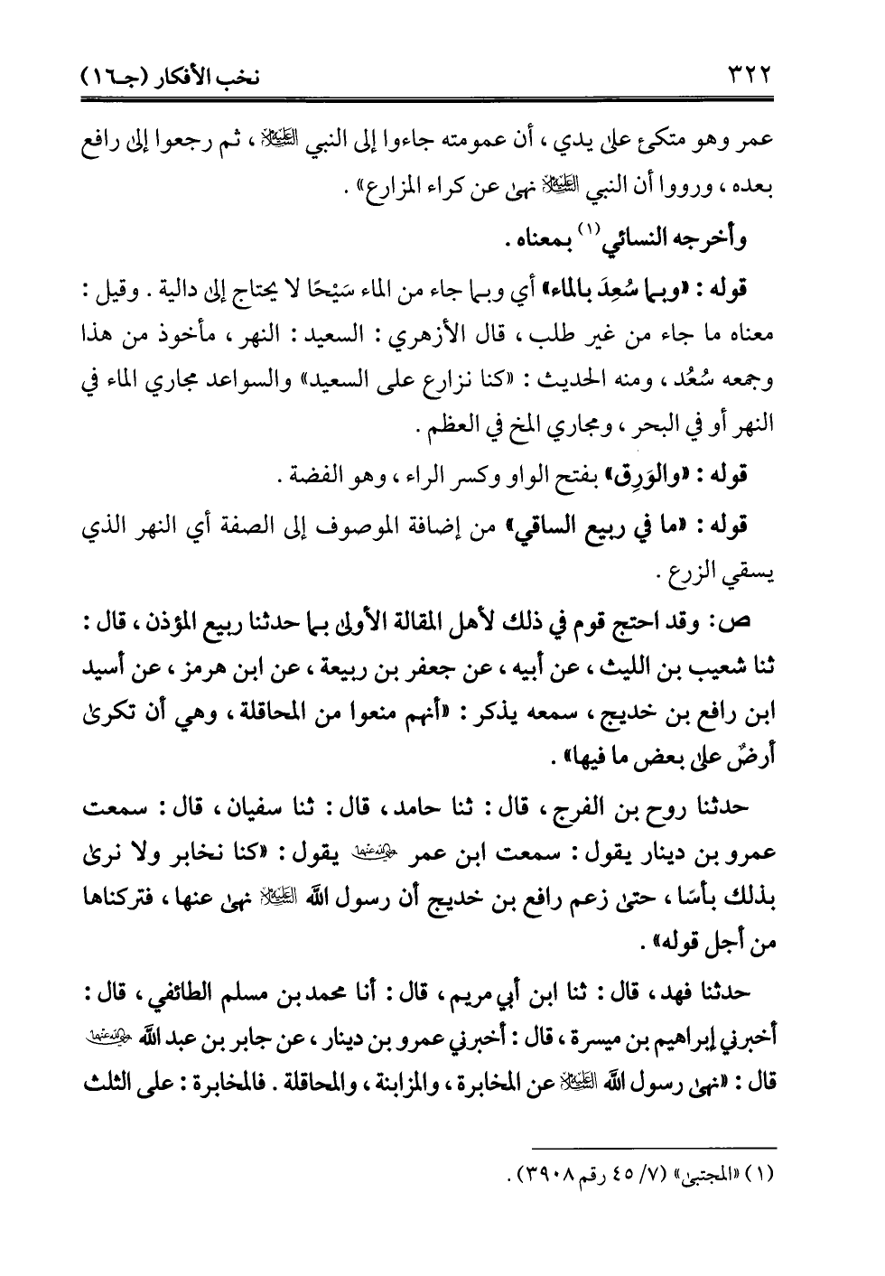 عمر وهو متكئ على يدي، أن عمومته جاءوا إلى النبي -عليه السلام-، ثم رجعوا إلى رافع بعده، ورووا أن النبي -عليه السلام- نهى عن كراء المزارع".