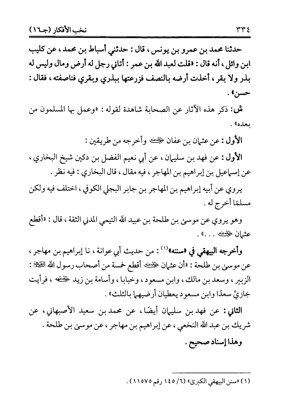 وأخرجه البيهقي في "سننه" (¬1): من حديث أبي عوانة، نا إبراهيم بن مهاجر، عن موسى بن طلحة: "أن عثمان - رضي الله عنه - أقطع خمسة من أصحاب رسول الله -عليه السلام-: الزبير، وسعد بن مالك، وابن مسعود، وخبابا، وأسامة بن زيد - رضي الله عنهم -، فرأيت جَارَيَّ سعدًا وابن مسعود يعطيان أرضيهما بالثلث".