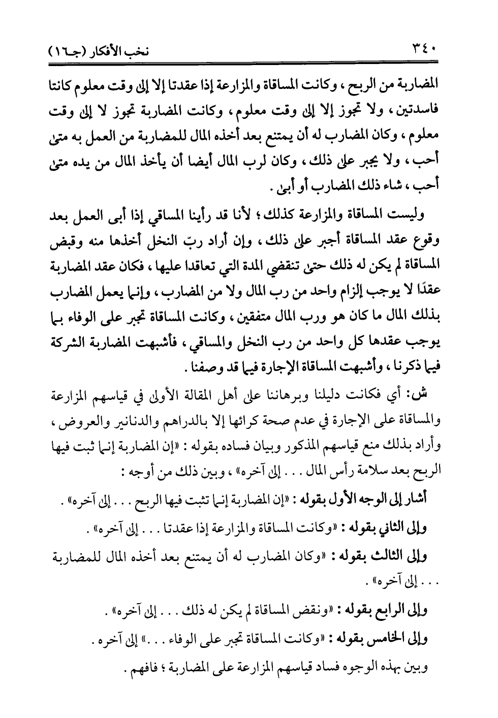 وليست المساقاة والمزارعة كذلك؛ لأنا قد رأينا المساقي إذا أبى العمل بعد وقوع عقد المساقاة أجبر على ذلك، وإن أراد ربّ النخل أخذها منه وقبض المساقاة لم يكن له ذلك حتى تنقضي المدة التي تعاقدا عليها، فكان عقد المضاربة عقدًا لا يوجب إلزام واحد من رب المال ولا من المضارب، وإنما يعمل المضارب بذلك المال ما كان هو ورب المال متفقين، وكانت المساقاة تجبر على الوفاء بما يوجب عقدها كل واحد من رب النخل والمساقي، فأشبهت المضاربة الشركة فيما ذكرنا، وأشبهت المساقاة الإجارة فيما قد وصفنا.