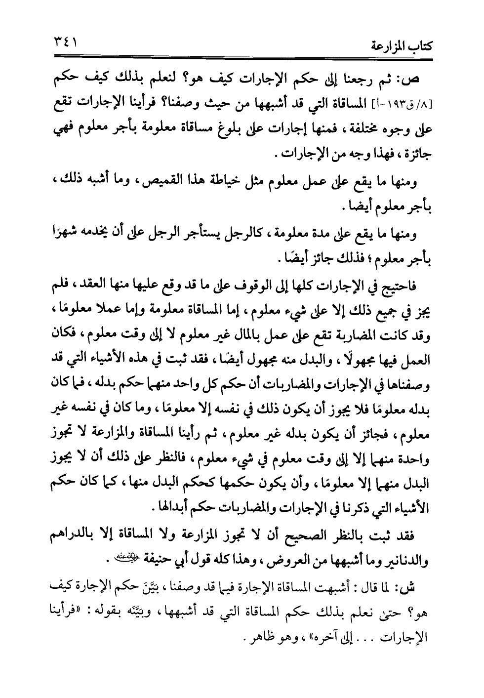 فاحتيج في الإجارات كلها إلى الوقوف على ما قد وقع عليها منها العقد، فلم يجز في جميع ذلك إلا على شيء معلوم، إما المساقاة معلومة وإما عملا معلومًا، وقد كانت المضاربة تقع على عمل بالمال غير معلوم لا إلى وقت معلوم، فكان العمل فيها مجهولًا، والبدل منه مجهول أيضًا، فقد ثبت في هذه الأشياء التي قد وصفناها في الإجارات والمضاربات أن حكم كل واحد منهما حكم بدله، فما كان بدله معلومًا فلا يجوز أن يكون ذلك في نفسه إلا معلومًا، وما كان في نفسه غير معلوم، فجائز أن يكون بدله غير معلوم، ثم رأينا المساقاة والمزارعة لا تجوز واحدة منهما إلا إلى وقت معلوم في شيء معلوم، فالنظر على ذلك أن لا يجوز البدل منهما إلا معلومًا، وأن يكون حكمها كحكم البدل منها، كما كان حكم الأشياء التي ذكرنا في الإجارات والمضاربات حكم أبدالها.