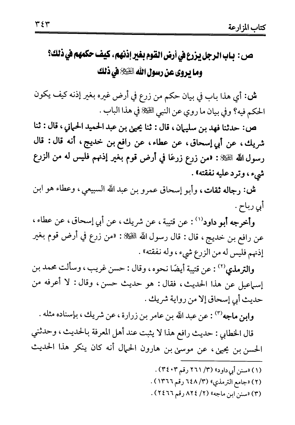 ص: حدثنا فهد بن سليمان، قال: ثنا يحيى بن عبد الحميد الحماني، قال: ثنا شريك، عن أبي إسحاق، عن عطاء، عن رافع بن خديج، أنه قال: قال رسول الله -عليه السلام-: "من زرع زرعًا في أرض قوم بغير إذنهم فليس له من الزرع شيء، وترد عليه نفقته".