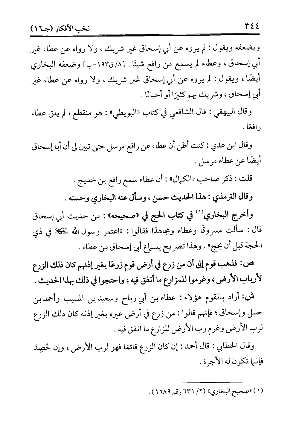 ويضعفه ويقول: لم يروه عن أبي إسحاق غير شريك، ولا رواه عن عطاء غير أبي إسحاق، وعطاء لم يسمع من رافع شيئًا. وضعفه البخاري أيضًا، ويقول: لم يروه عن أبي إسحاق غير شريك، ولا رواه عن عطاء غير أبي إسحاق، وشريك يهم كثيرًا أو أحيانًا.