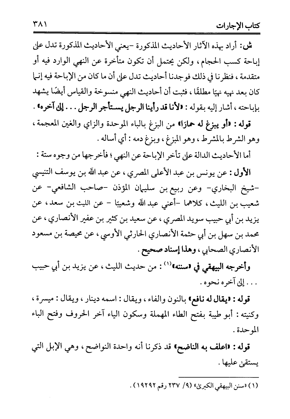 أما الأحاديث الدالة على تأخر الإباحة عن النهي؛ فأخرجها من وجوه ستة: الأول: عن يونس بن عبد الأعلى المصري، عن عبد الله بن يوسف التنيسي -شيخ البخاري- وعن ربيع بن سليمان المؤذن -صاحب الشافعي- عن شعيب بن الليث، كلاهما -أعني عبد الله وشعيبًا- عن الليث بن سعد، عن يزيد بن أبي حبيب سويد المصري، عن سعيد بن كثير بن عفير الأنصاري، عن محمد بن سهل بن أبي حثمة الأنصاري الحارثي الأوسي، عن محيصة بن مسعود الأنصاري الصحابي، وهذا إسناد صحيح.