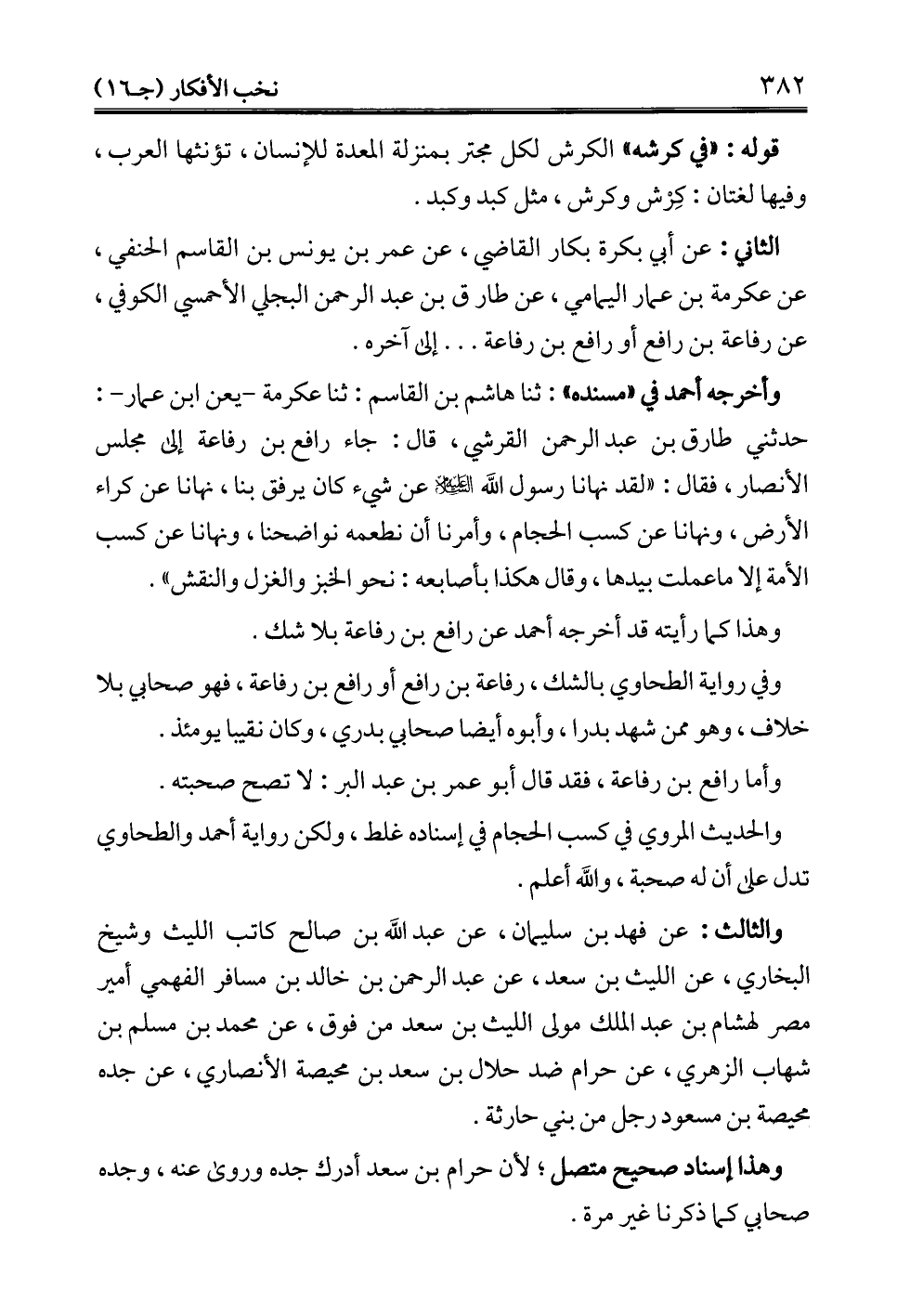 وأخرجه أحمد في "مسنده": ثنا هاشم بن القاسم: ثنا عكرمة -يعني ابن عمار-: حدثني طارق بن عبد الرحمن القرشي، قال: جاء رافع بن رفاعة إلى مجلس الأنصار، فقال: "لقد نهانا رسول الله -عليه السلام- عن شيء كان يرفق بنا، نهانا عن كراء الأرض، ونهانا عن كسب الحجام، وأمرنا أن نطعمه نواضحنا، ونهانا عن كسب الأمة إلا ما عملت بيدها، وقال هكذا بأصابعه: نحو الخبز والغزل والنقش".