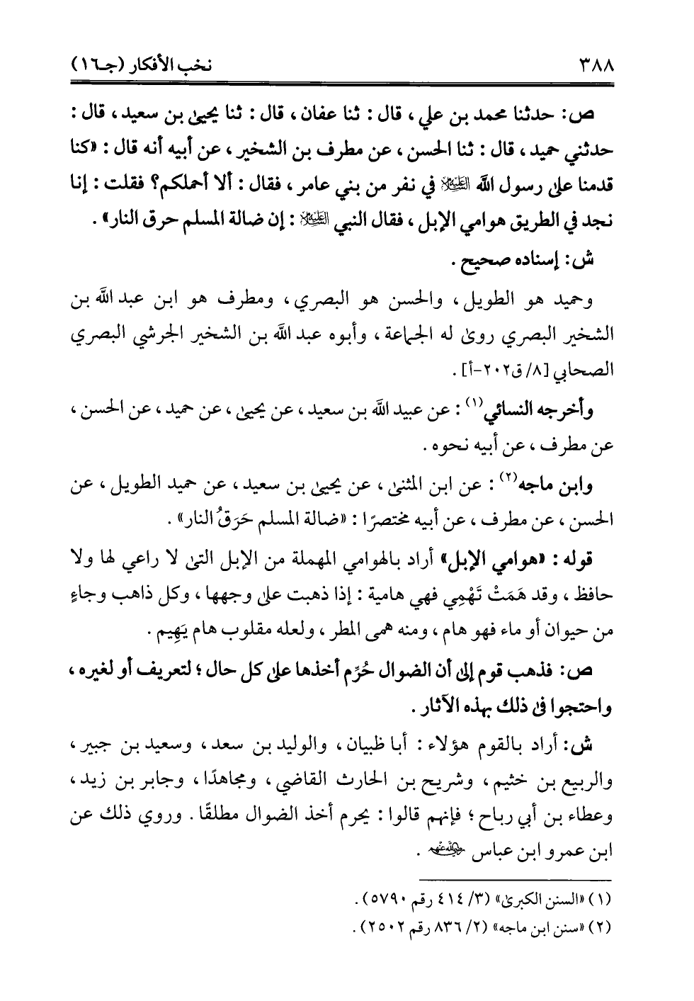 ص: حدثنا محمد بن علي، قال: ثنا عفان، قال: ثنا يحيى بن سعيد، قال: حدثني حميد، قال: ثنا الحسن، عن مطرف بن الشخير، عن أبيه أنه قال: "كنا قدمنا على رسول الله -عليه السلام- في نفر من بني عامر، فقال: ألا أحملكم؟ فقلت: إنا نجد في الطريق هوامي الإبل، فقال النبي -عليه السلام-: إن ضالة المسلم حرق النار".