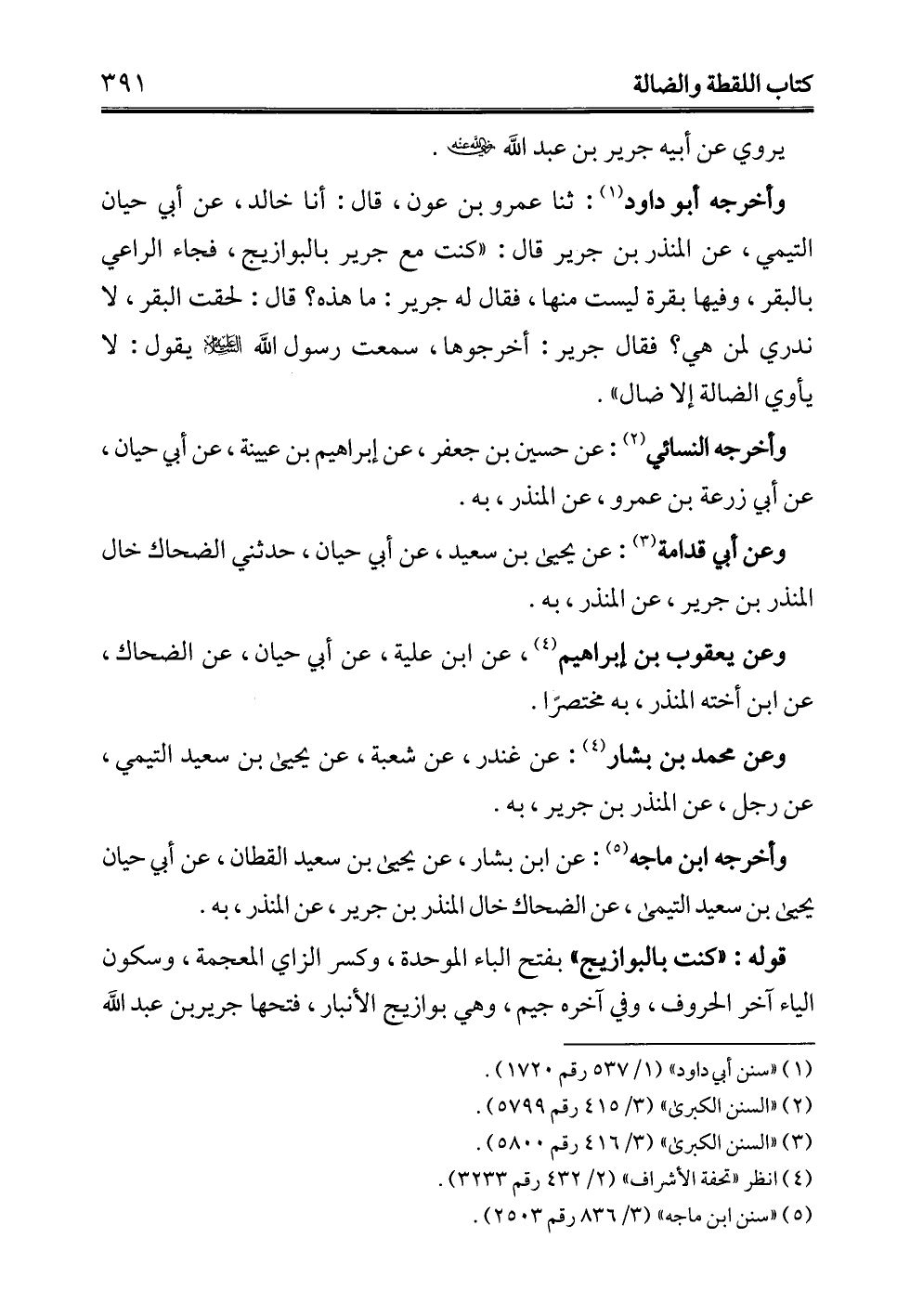 وأخرجه أبو داود (¬1): ثنا عمرو بن عون، قال: أنا خالد، عن أبي حيان التيمي، عن المنذر بن جرير قال: "كنت مع جرير بالبوازيج، فجاء الراعي بالبقر، وفيها بقرة ليست منها، فقال له جرير: ما هذه؟ قال: لحقت البقر، لا ندري لمن هي؟ فقال جرير: أخرجوها، سمعت رسول الله -عليه السلام- يقول: لا يأوي الضالة إلا ضال".