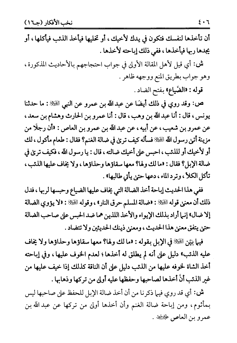 ش: أي قد روي فيما ذكرنا من أن أخذ ضالة الإبل للحفظ على صاحبها ليس بمأثوم، ومن إباحة ضالة الغنم وأن أخذها أولى من تركها عن عبد الله بن عمرو بن العاص - رضي الله عنهما -.