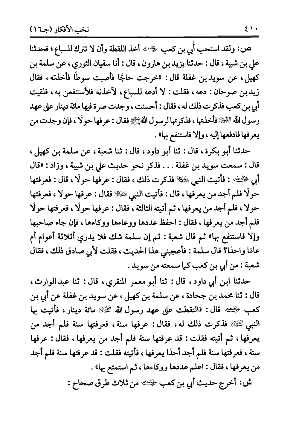 حدثنا ابن أبي داود، قال: ثنا أبو معمر المنقري، قال: ثنا عبد الوارث، قال: ثنا محمد بن جحادة، عن سلمة بن كهيل، عن سويد بن غفلة عن أبي بن كعب - رضي الله عنه - قال: "التقطت على عهد رسول الله -عليه السلام- مائة دينار، فأتيت بها النبي -عليه السلام- فذكرت ذلك له، فقال: عرفها سنة، فعرفتها سنة فلم أجد من يعرفها، ثم أتيته فقلت: قد عرفتها سنة فلم أجد من يعرفها، فقال: عرفها سنة، فعرفتها سنة فلم أجد أحدًا يعرفها، فأتيته فقلت: قد عرفتها سنة فلم أجد من يعرفها، فقال: اعلم عددها ووكاءها، ثم استمتع بها".