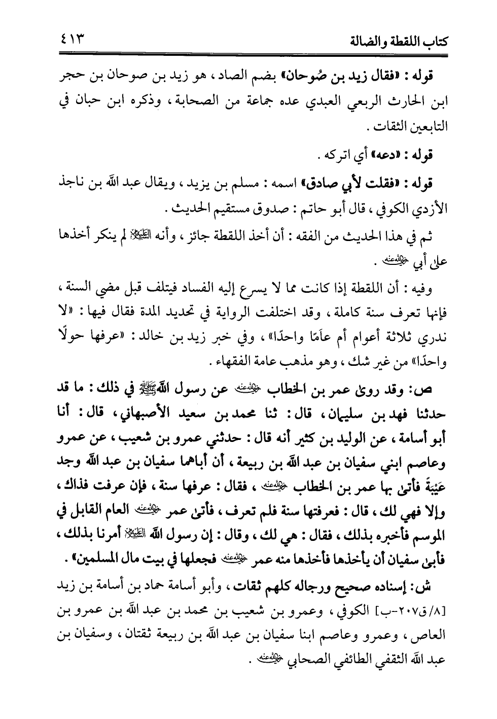 ص: وقد روى عمر بن الخطاب - رضي الله عنه - عن رسول الله - صلى الله عليه وسلم - في ذلك: ما قد حدثنا فهد بن سليمان، قال: ثنا محمد بن سعيد الأصبهاني، قال: أنا أبو أسامة، عن الوليد بن كثير أنه قال: حدثني عمرو بن شعيب، عن عمرو وعاصم ابني سفيان بن عبد الله بن ربيعة، أن أباهما سفيان بن عبد الله وجد عَيْبَةَ فأتى بها عمر بن الخطاب - رضي الله عنه -، فقال: عرفها سنة، فإن عرفت فذاك، وإلا فهي لك، قال: فعرفتها سنة فلم تعرف، فأتى عمر - رضي الله عنه - العام القابل في الموسم فأخبره بذلك، فقال: هي لك، وقال: إن رسول الله -عليه السلام- أمرنا بذلك، فأبى سفيان أن يأخذها فأخذها منه عمر - رضي الله عنه - فجعلها في بيت مال المسلمين".