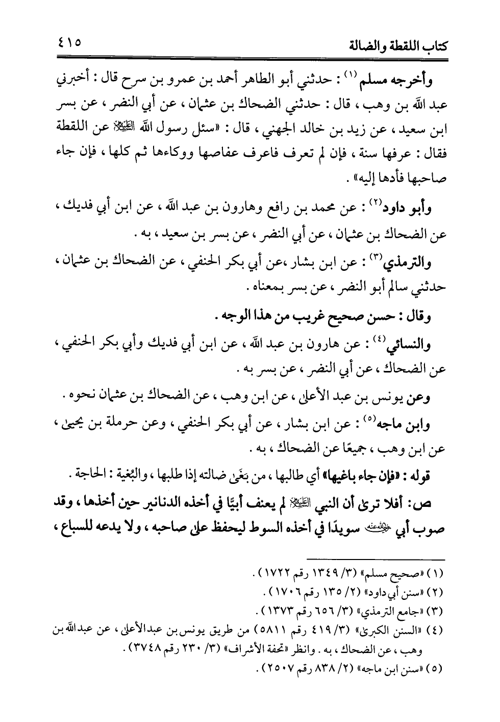 وأخرجه مسلم (¬1): حدثني أبو الطاهر أحمد بن عمرو بن سرح قال: أخبرني عبد الله بن وهب، قال: حدثني الضحاك بن عثمان، عن أبي النضر، عن بسر بن سعيد، عن زيد بن خالد الجهني، قال: "سئل رسول الله -عليه السلام- عن اللقطة فقال: عرفها سنة، فإن لم تعرف فاعرف عفاصها ووكاءها ثم كلها، فإن جاء صاحبها فأدها إليه".