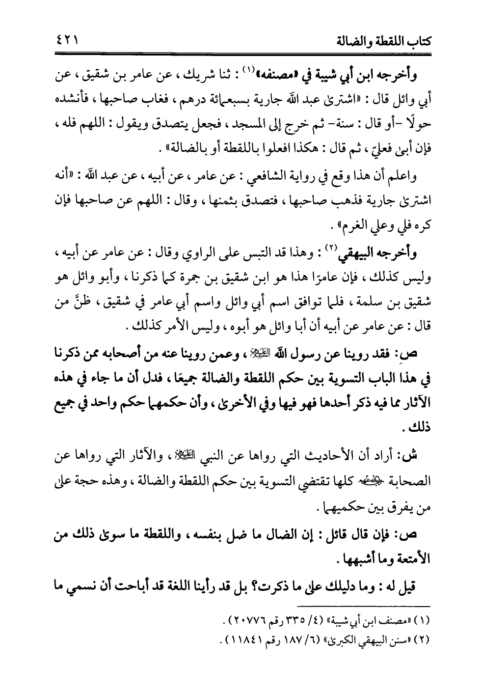 ش: أراد أن الأحاديث التي رواها عن النبي -عليه السلام-، والآثار التي رواها عن الصحابة - رضي الله عنهم - كلها تقتضي التسوية بين حكم اللقطة والضالة، وهذه حجة على من يفرق بين حكميهما.