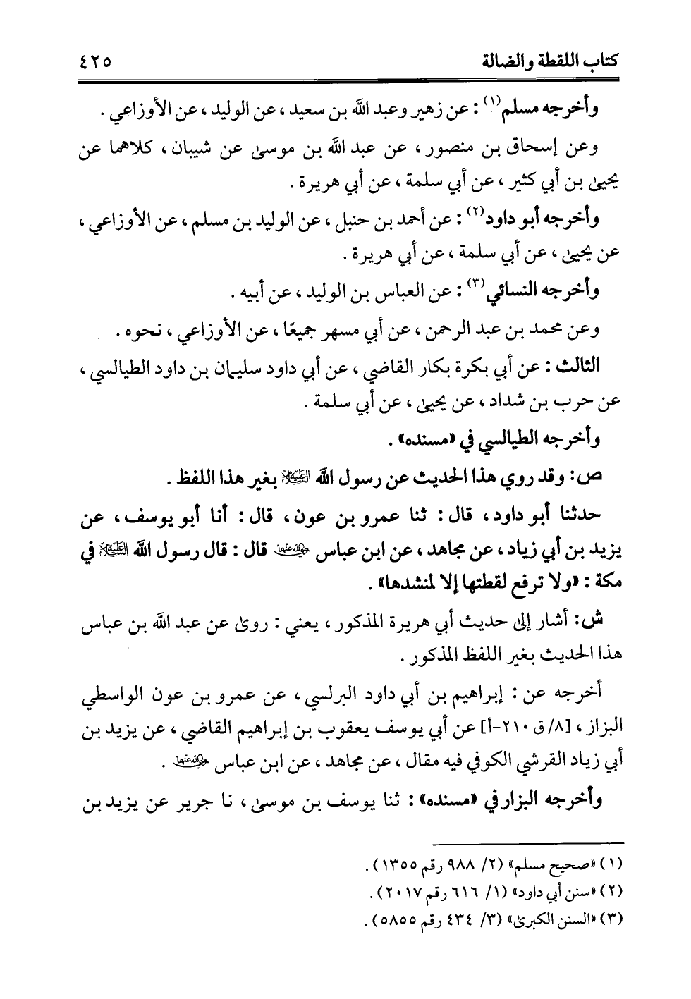 حدثنا أبو داود، قال: ثنا عمرو بن عون، قال: أنا أبو يوسف، عن يزيد بن أبي زياد، عن مجاهد، عن ابن عباس - رضي الله عنهما - قال: قال رسول الله -عليه السلام- في مكة: "ولا ترفع لقطتها إلا لمنشدها".