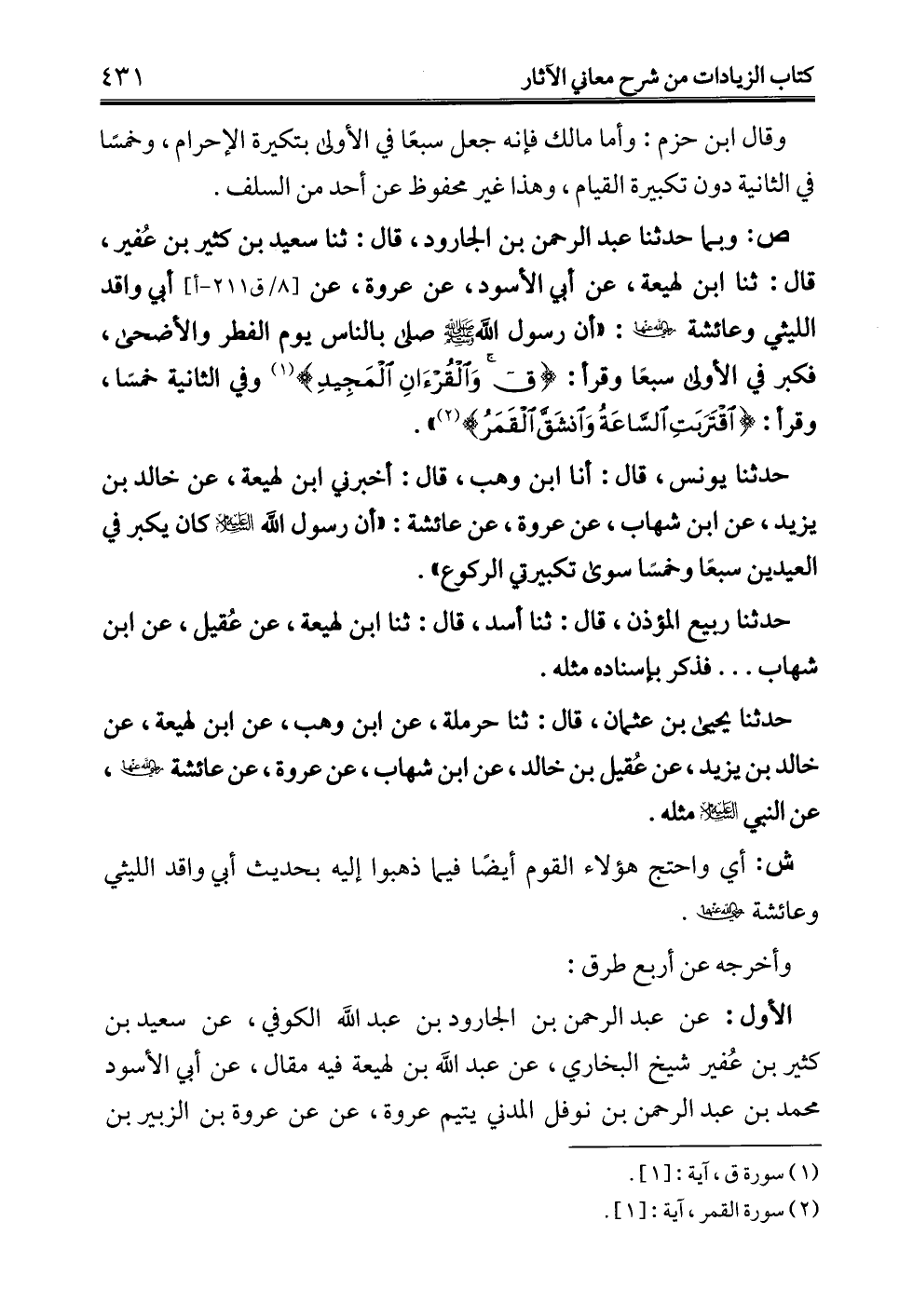 ص: وبما حدثنا عبد الرحمن بن الجارود، قال: ثنا سعيد بن كثير بن عُفير، قال: ثنا ابن لهيعة، عن أبي الأسود، عن عروة، عن أبي واقد الليثي وعائشة - رضي الله عنها -: "أن رسول الله - صلى الله عليه وسلم - صلى بالناس يوم الفطر والأضحى، فكبر في الأولى سبعًا وقرأ: {ق وَالْقُرْآنِ الْمَجِيدِ} (¬1) وفي الثانية خمسًا، وقرأ: {اقْتَرَبَتِ السَّاعَةُ وَانْشَقَّ الْقَمَرُ} (¬2) ".