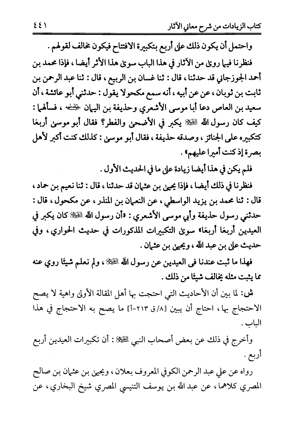 فنظرنا فيما روى من الآثار في هذا الباب سوى هذا الأثر أيضًا، فإذا محمد بن أحمد الجوزجاني قد حدثنا، قال: ثنا غسان بن الربيع، قال: ثنا عبد الرحمن بن ثابت بن ثوبان، عن أبيه، أنه سمع مكحولا يقول: حدثني أبو عائشة، أن سعيد بن العاص دعا أبا موسى الأشعري وحذيفة بن اليمان - رضي الله عنهم -، فسألهما: كيف كان رسول الله -عليه السلام- يكبر في الأضحى والفطر؟ فقال أبو موسى أربعًا كتكبيره على الجنائز، وصدقه حذيفة، فقال أبو موسى: كذلك كنت أكبر لأهل بصرة إذ كنت أميرا عليهم".