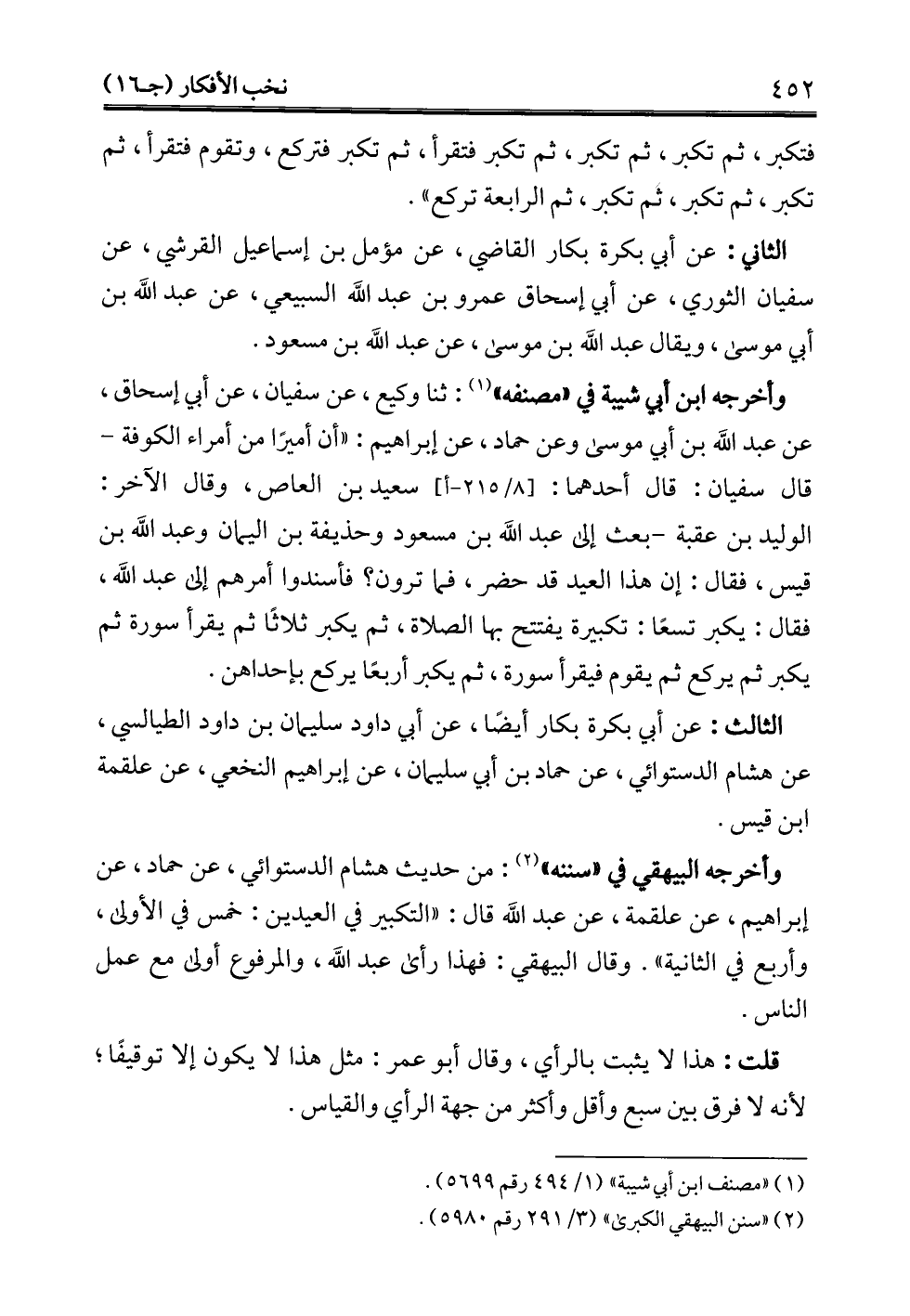 وأخرجه ابن أبي شيبة في "مصنفه" (¬1): ثنا وكيع، عن سفيان، عن أبي إسحاق، عن عبد الله بن أبي موسى وعن حماد، عن إبراهيم: "أن أميرًا من أمراء الكوفة -قال سفيان: قال أحدهما: سعيد بن العاص، وقال الآخر: الوليد بن عقبة- بعث إلى عبد الله بن مسعود وحذيفة بن اليمان وعبد الله بن قيس، فقال: إن هذا العيد قد حضر، فما ترون؟ فأسندوا أمرهم إلى عبد الله، فقال: يكبر تسعًا: تكبيرة يفتتح بها الصلاة، ثم يكبر ثلاثًا ثم يقرأ سورة ثم يكبر ثم يركع ثم يقوم فيقرأ سورة، ثم يكبر أربعًا يركع بإحداهن.