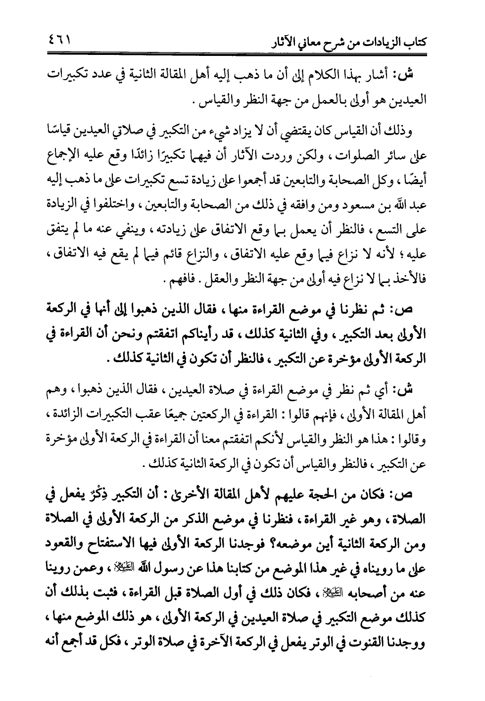 وذلك أن القياس كان يقتضي أن لا يزاد شيء من التكبير في صلاتي العيدين قياسًا على سائر الصلوات، ولكن وردت الآثار أن فيهما تكبيرًا زائدًا وقع عليه الإجماع أيضًا، وكل الصحابة والتابعين قد أجمعوا عل زيادة تسع تكبيرات على ما ذهب إليه عبد الله بن مسعود ومن وافقه في ذلك من الصحابة والتابعين، واختلفوا في الزيادة على التسع، فالنظر أن يعمل بما وقع الاتفاق على زيادته، وينفي عنه ما لم يتفق عليه؛ لأنه لا نزاع فيما وقع عليه الاتفاق، والنزاع قائم فيما لم يقع فيه الاتفاق، فالأخذ بما لا نزاع فيه أولى من جهة النظر والعقل. فافهم.