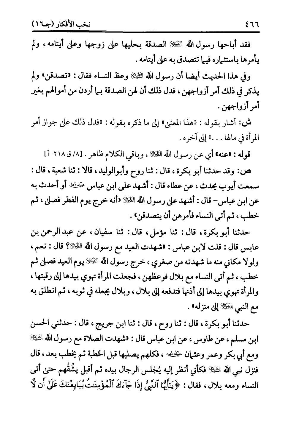 حدثنا أبو بكرة، قال: ثنا روح، قال: ثنا ابن جريج، قال: حدثني الحسن ابن مسلم، عن طاوس، عن ابن عباس قال: "شهدت الصلاة مع رسول الله -عليه السلام- ومع أبي بكر وعمر وعثمان - رضي الله عنهم -، فكلهم يصليها قبل الخطبة ثم يخطب بعد، قال فنزل نبي الله -عليه السلام- فكأني أنظر إليه يُجْلس الرجال بيده ثم أقبل يشُقُّهم حتى أتى النساء ومعه بلال، فقال: {يَا أَيُّهَا النَّبِيُّ إِذَا جَاءَكَ الْمُؤْمِنَاتُ يُبَايِعْنَكَ عَلَى أَنْ لَا