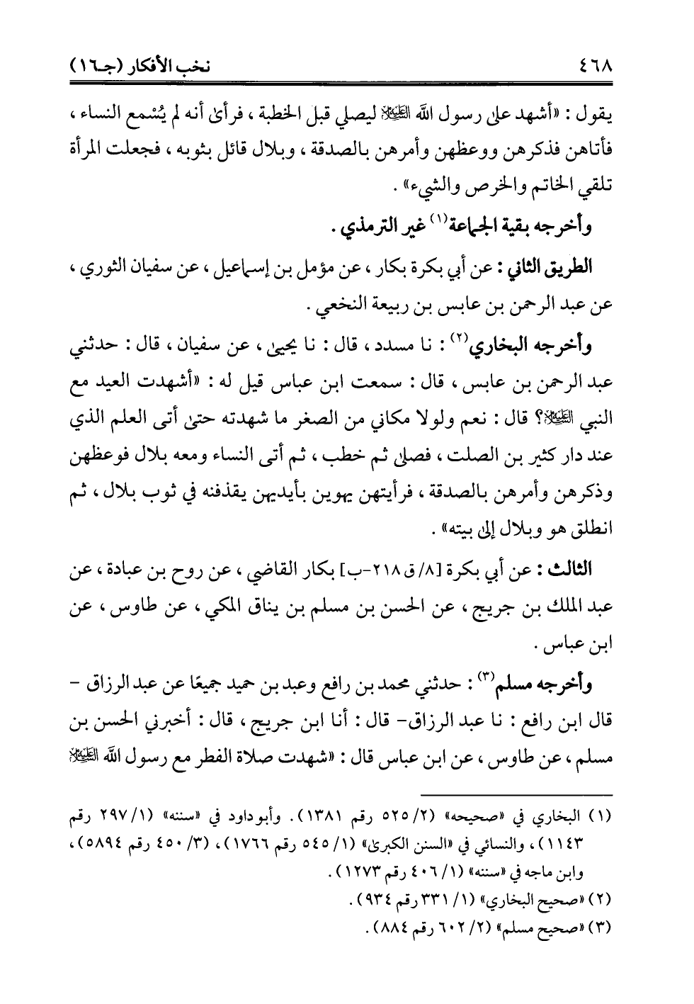 وأخرجه مسلم (¬3): حدثني محمد بن رافع وعبد بن حميد جميعًا عن عبد الرزاق -قال ابن رافع: نا عبد الرزاق- قال: أنا ابن جريج، قال: أخبرني الحسن بن مسلم، عن طاوس، عن ابن عباس قال: "شهدت صلاة الفطر مع رسول الله -عليه السلام-