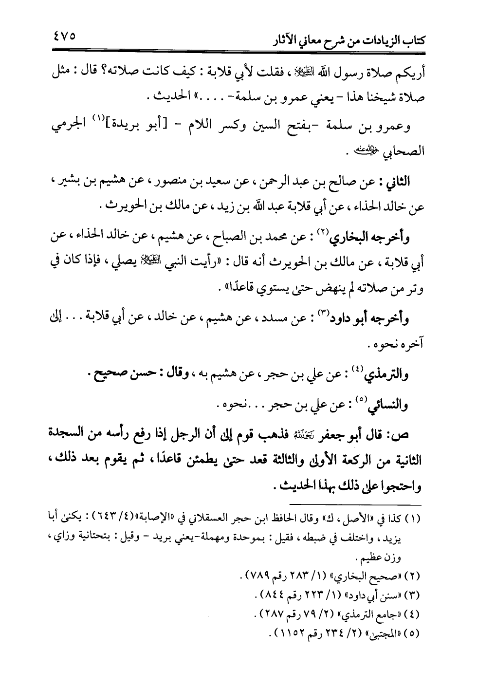 ص: قال أبو جعفر -رحمه الله- فذهب قوم إلى أن الرجل إذا رفع رأسه من السجدة الثانية من الركعة الأولى والثالثة قعد حتى يطمئن قاعدًا، ثم يقوم بعد ذلك، واحتجوا على ذلك بهذا الحديث.
