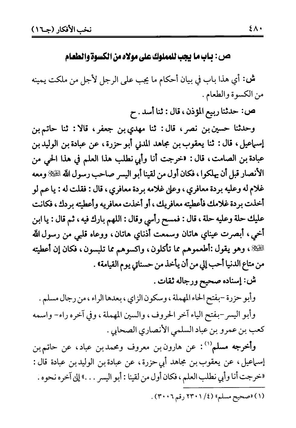 وحدثنا حسين بن نصر، قال: ثنا مهدي بن جعفر، قالا: ثنا حاتم بن إسماعيل، قال: ثنا يعقوب بن مجاهد المدني أبو حزرة، عن عبادة بن الوليد بن عبادة بن الصامت، قال: "خرجت أنا وأبي نطلب هذا العلم في هذا الحي من الأنصار قبل أن يهلكوا، فكان أول من لقينا أبو اليسر صاحب رسول الله -عليه السلام- ومعه غلام له وعليه بردة معافري، وعلى غلامه بردة معافري، قال: فقلت له: يا عم لو أخذت بردة غلامك فأعطيته معافريك، أو أخذت معافريه وأعطيته بردك، فكانت عليك حلة وعليه حلة، قال: فمسح رأسي وقال: اللهم بارك فيه، ثم قال: يا ابن أخي، أبصرت عيناي هاتان وسمعت أذناي هاتان، ووعاه قلبي من رسول الله -عليه السلام-، وهو يقول: أطعموهم مما تأكلون، واكسوهم مما تلبسون، فكان إن أعطيته من متاع الدنيا أحب إلي من أن يأخذ من حسناتي يوم القيامة".