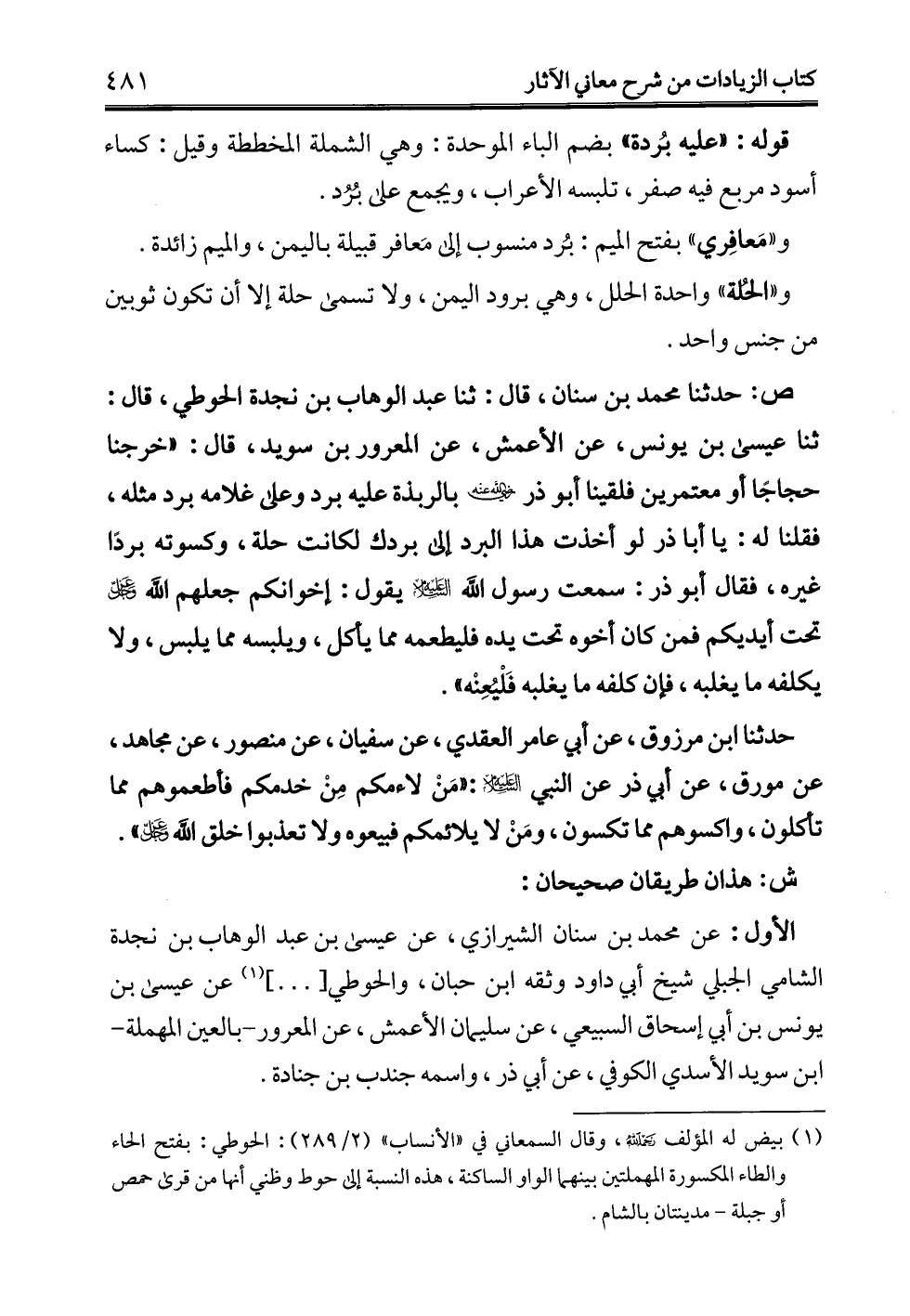 ص: حدثنا محمد بن سنان، قال: ثنا عبد الوهاب بن نجدة الحوطي، قال: ثنا عيسى بن يونس، عن الأعمش، عن المعرور بن سويد، قال: "خرجنا حجاجًا أو معتمرين فلقينا أبو ذر - رضي الله عنه - بالربذة عليه برد وعلى غلامه برد مثله، فقلنا له: يا أبا ذر لو أخذت هذا البرد إلى بردك لكانت حلة، وكسوته بردًا غيره، فقال أبو ذر: سمعت رسول الله -عليه السلام- يقول: إخوانكم جعلهم الله -عز وجل- تحت أيديكم فمن كان أخوه تحت يده فليطعمه مما يأكل، ويلبسه مما يلبس، ولا يكلفه ما يغلبه، فإن كلفه ما يغلبه فَلْيُعِنْه".