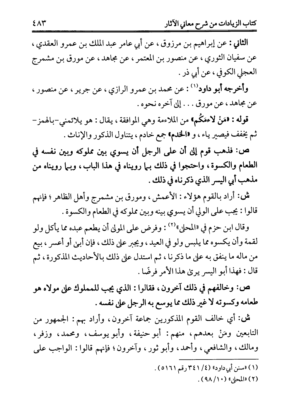 ص: فذهب قوم إلى أن على الرجل أن يسوي بين مملوكه وبين نفسه في الطعام والكسوة، واحتجوا في ذلك بما رويناه في هذا الباب، وبما رويناه من مذهب أبي اليسر الذي ذكرناه في ذلك.