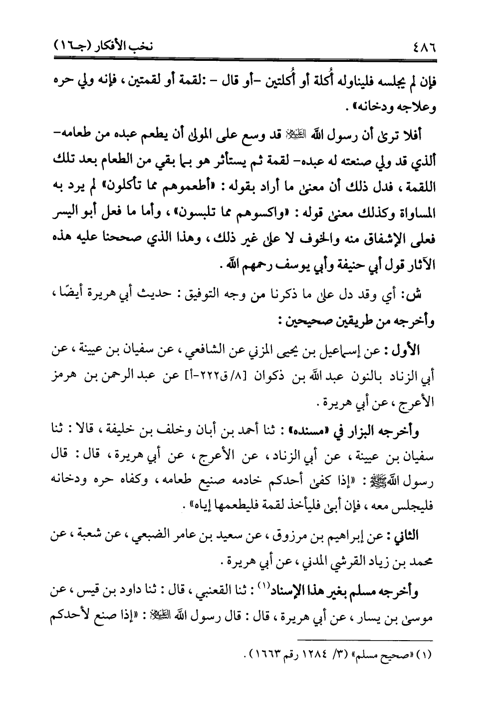 وأخرجه البزار في "مسنده": ثنا أحمد بن أبان وخلف بن خليفة، قالا: ثنا سفيان بن عيينة، عن أبي الزناد، عن الأعرج، عن أبي هريرة، قال: قال رسول الله - صلى الله عليه وسلم -: "إذا كفى أحدكم خادمه صنيع طعامه، وكفاه حره ودخانه فليجلس معه، فإن أبى فليأخذ لقمة فليطعمها إياه".
