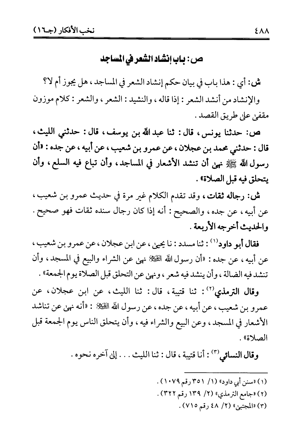 وقال الترمذي (¬2): ثنا قتيبة، قال: ثنا الليث، عن ابن عجلان، عن عمرو بن شعيب، عن أبيه، عن جده، عن رسول الله -عليه السلام-: "أنه نهى عن تناشد الأشعار في المسجد، وعن البيع والشراء فيه، وأن يتحلق الناس يوم الجمعة قبل الصلاة".