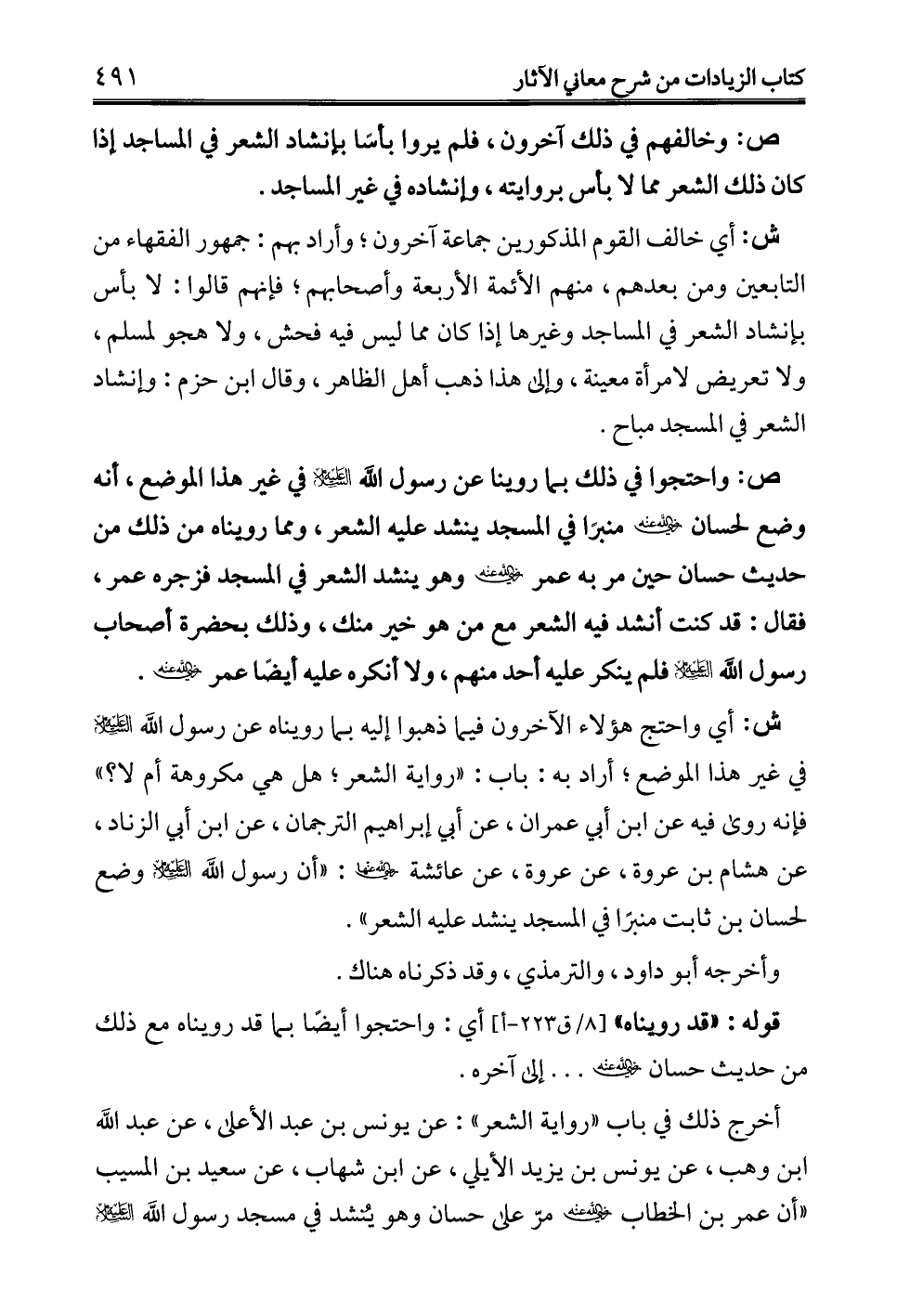 ص: وخالفهم في ذلك آخرون، فلم يروا بأسًا بإنشاد الشعر في المساجد إذا كان ذلك الشعر مما لا بأس بروايته، وإنشاده في غير المساجد.