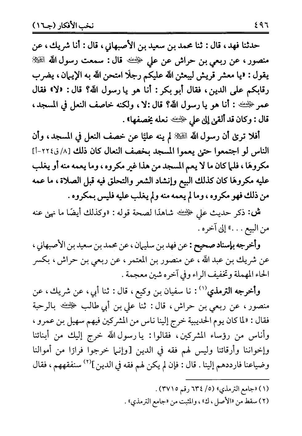 وأخرجه الترمذي (¬1): نا سفيان بن وكيع، قال: ثنا أبي، عن شريك، عن منصور، عن ربعي بن حراش، قال: ثنا علي بن أبي طالب - رضي الله عنه - بالرحبة فقال: "لما كان يوم الحديبية خرج إلينا ناس من المشركين فيهم سهيل بن عمرو، وأناس من رؤساء المشركين، فقالوا: يا رسول الله خرج إليك من أبنائنا وإخواننا وأرقائنا وليس لهم فقه في الدين [وإنما خرجوا فرارًا من أموالنا وضياعنا فارددهم إلينا. قال: فإن لم يكن لهم فقه في الدين] (¬2) سنفقههم، فقال