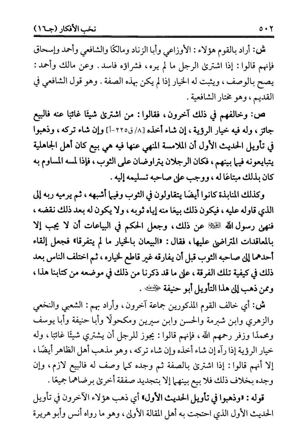 ش: أراد بالقوم هؤلاء: الأوزاعي وأبا الزناد ومالكًا والشافعي وأحمد وإسحاق فإنهم قالوا: إذا اشترى الرجل ما لم يره، فشراؤه فاسد. وعن مالك وأحمد: يصح بالوصف، ويثبت له الخيار إذا لم يكن بهذه الصفة. وهو قول الشافعي في القديم، وهو مختار الشافعية.