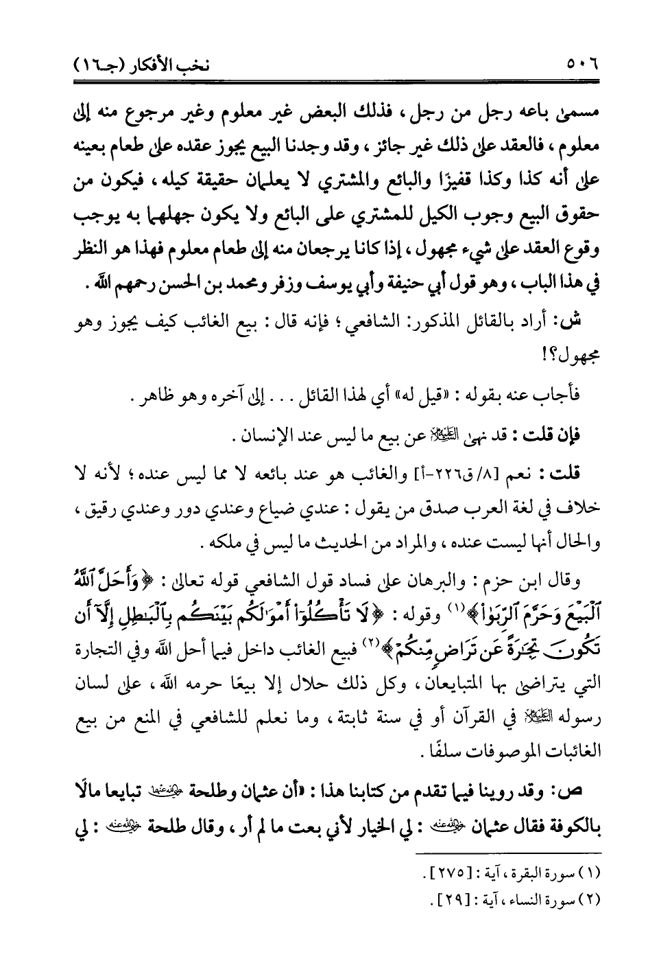 ص: وقد روينا فيما تقدم من كتابنا هذا: "أن عثمان وطلحة - رضي الله عنهما - تبايعا مالًا بالكوفة فقال عثمان - رضي الله عنه -: لي الخيار لأني بعت ما لم أر، وقال طلحة - رضي الله عنه -: لي