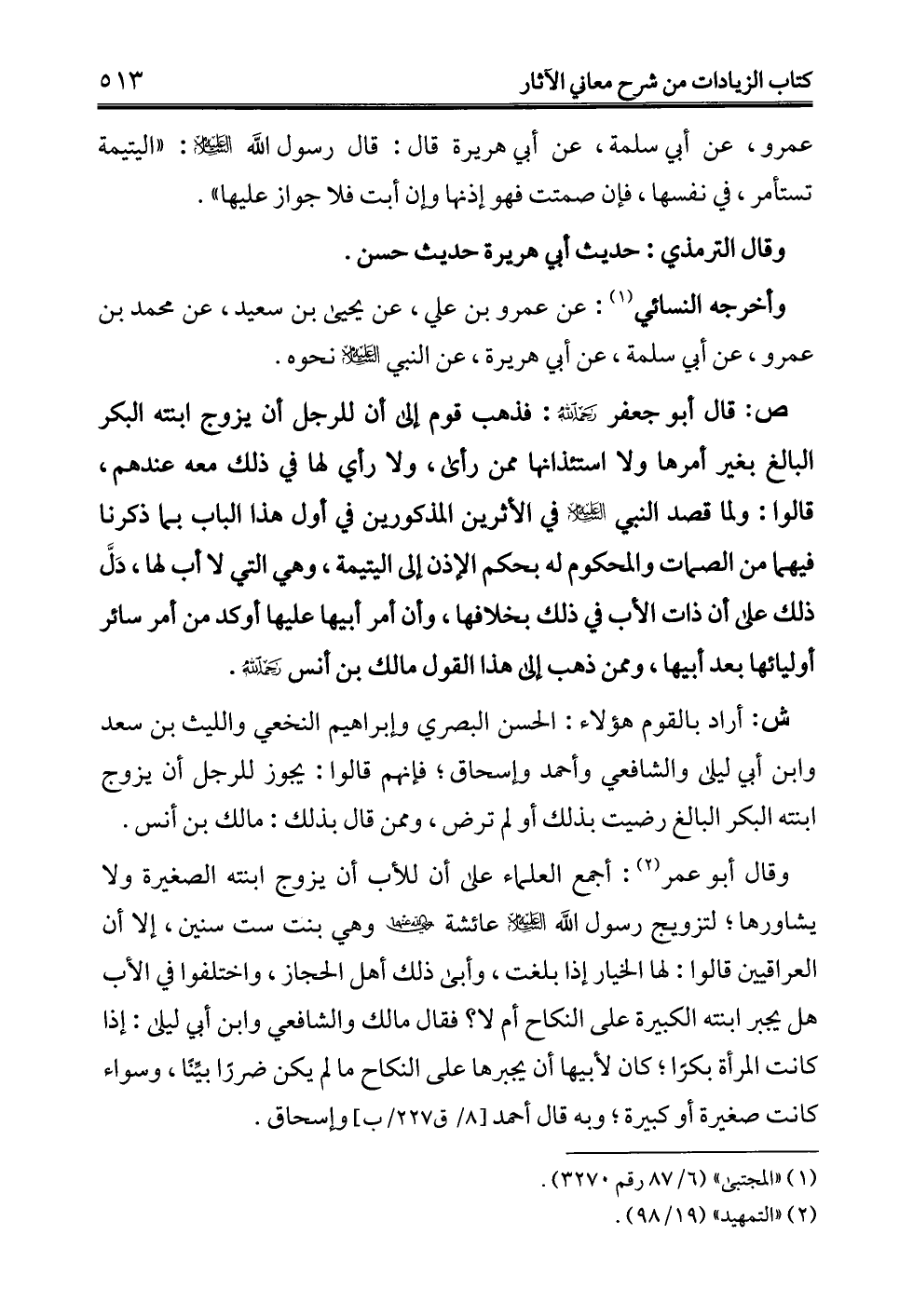 ص: قال أبو جعفر -رحمه الله-: فذهب قوم إلى أن للرجل أن يزوج ابنته البكر البالغ بغير أمرها ولا استئذانها ممن رأى، ولا رأي لها في ذلك معه عندهم، قالوا: ولما قصد النبي -عليه السلام- في الأثرين المذكورين في أول هذا الباب بما ذكرنا فيهما من الصمات والمحكوم له بحكم الإذن إلى اليتيمة، وهي التي لا أب لها، دَلَّ ذلك على أن ذات الأب في ذلك بخلافها، وأن أمر أبيها عليها أوكد من أمر سائر أوليائها بعد أبيها، وممن ذهب إلى هذا القول مالك بن أنس -رحمه الله-.