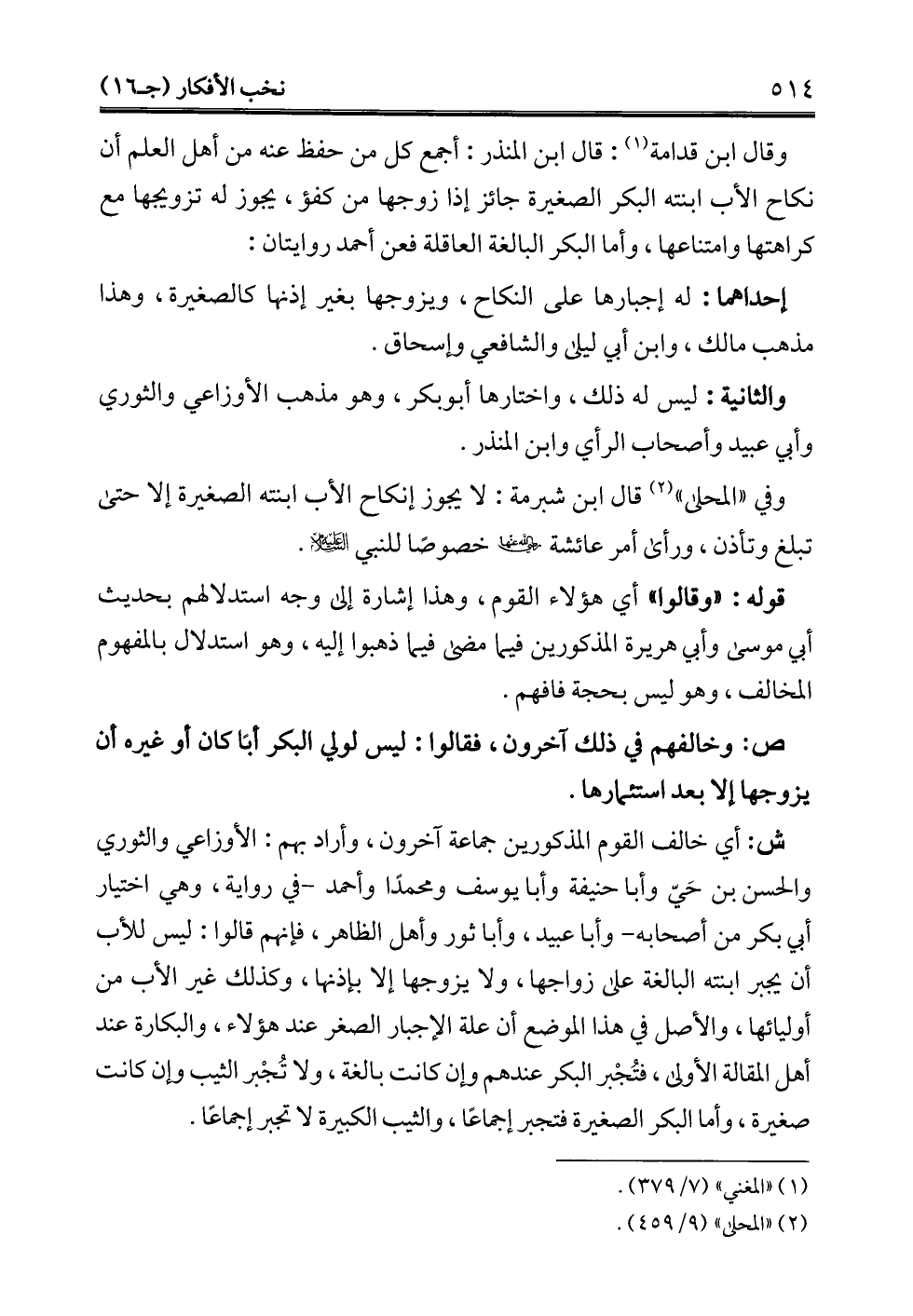 ش: أي خالف القوم المذكورين جماعة آخرون، وأراد بهم: الأوزاعي والثوري والحسن بن حَيّ وأبا حنيفة وأبا يوسف ومحمدًا وأحمد -في رواية، وهي اختيار أبي بكر من أصحابه- وأبا عبيد، وأبا ثور وأهل الظاهر، فإنهم قالوا: ليس للأب أن يجبر ابنته البالغة على زواجها، ولا يزوجها إلا بإذنها، وكذلك غير الأب من أوليائها، والأصل في هذا الموضع أن علة الإجبار الصغر عند هؤلاء، والبكارة عند أهل المقالة الأولى، فتُجْبر البكر عندهم وإن كانت بالغة، ولا تُجْبر الثيب وإن كانت صغيرة، وأما البكر الصغيرة فتجبر إجماعًا، والثيب الكبيرة لا تجبر إجماعًا.
