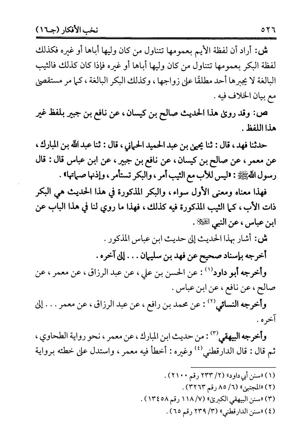 حدثنا فهد، قال: ثنا يحيى بن عبد الحميد الحماني، قال: ثنا عبد الله بن المبارك، عن معمر، عن صالح بن كيسان، عن نافع بن جبير، عن ابن عباس قال: قال رسول الله - صلى الله عليه وسلم -: "ليس للأب مع الثيب أمر، والبكر تستأمر، وإذنها صماتها".