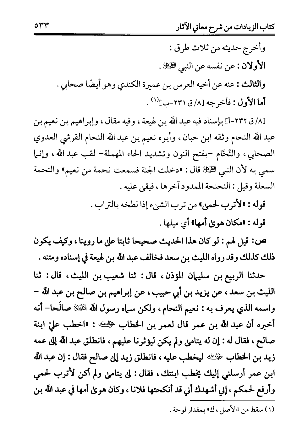 حدثنا الربيع بن سليمان المؤذن، قال: ثنا شعيب بن الليث، قال: ثنا الليث بن سعد، عن يزيد بن أبي حبيب، عن إبراهيم بن صالح بن عبد الله -واسمه الذي يعرف به: نعيم النحام، ولكن سماه رسول الله -عليه السلام- صالحًا- أنه أخبره أن عبد الله بن عمر قال لعمر بن الخطاب - رضي الله عنه -: "اخطب عليَّ ابنة صالح، فقال له: إن له يتامى ولم يكن ليؤثرنا عليهم، فانطلق عبد الله إلى عمه زيد بن الخطاب - رضي الله عنه - ليخطب عليه، فانطلق زيد إلى صالح فقال: إن عبد الله بن عمر أرسلني إليك يخطب ابنتك، فقال: لي يتامى ولم أكن لأترب لحمي وأرفع لحمكم، إني أشهدك أني قد أنكحتها فلانا، وكان هوى أمها في عبد الله بن