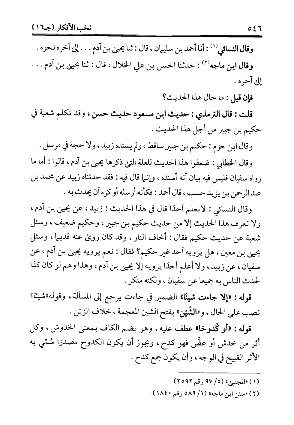 وقال النسائي: لا نعلم أحدًا قال في هذا الحديث: زبيد، عن يحيى بن آدم، ولا نعرف هذا الحديث إلا من حديث حكيم بن جبير، وحكيم ضعيف، وسئل شعبة عن حديث حكيم فقال: أخاف النار، وقد كان روى عنه قديما، وسئل يحيى بن معين، هل يرويه أحد غير حكيم؟ فقال: نعم يرويه يحيى بن آدم، عن سفيان، عن زبيد، ولا أعلم أحدًا يرويه إلا يحيى بن آدم، وهذا وهم لو كان كذا لحدث الناس به جميعًا عن سفيان، ولكنه منكر.