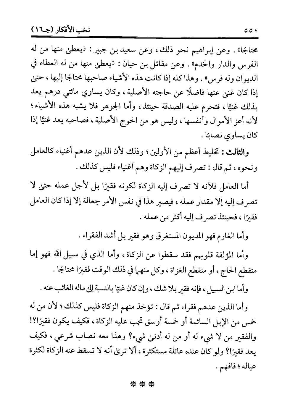 وأما الذين عندهم فقراء ثم قال: تؤخذ منهم الزكاة فليس كذلك؛ لأن من له خمس من الإبل السائمة أو خمسة أوسق تجب عليه الزكاة، فكيف يكون فقيرًا؟! والفقير من لا شيء له أو من له أدنى شيء؟ وهذا معه نصاب شرعي، فكيف يعد فقيرًا؟ ولو كان عنده عائلة مستكثرة، ألا ترى أنه لا تسقط عنه الزكاة لكثرة عياله؛ فافهم.