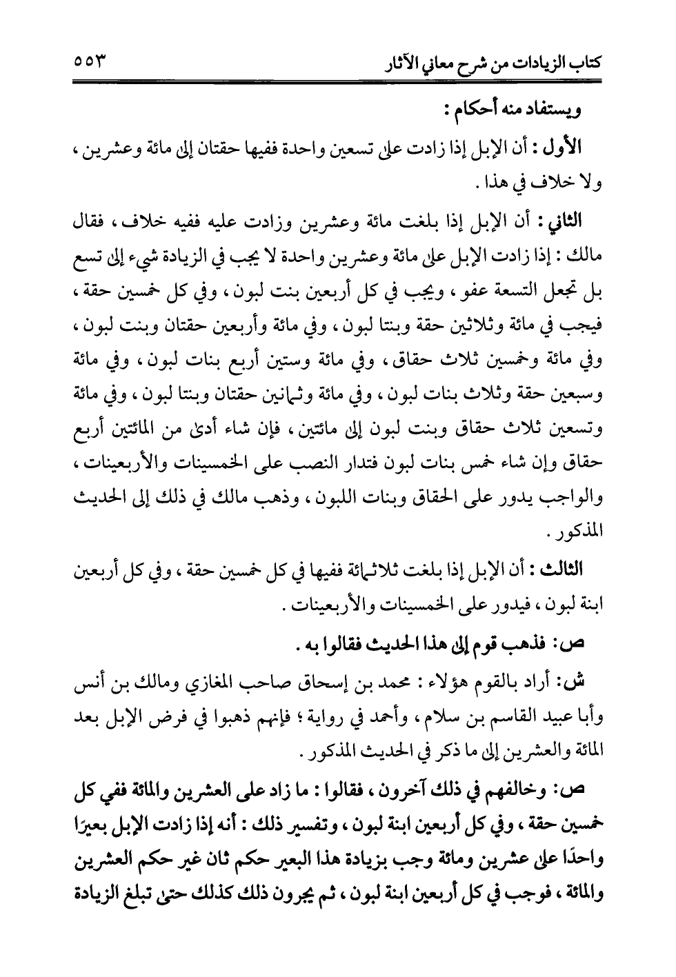 ش: أراد بالقوم هؤلاء: محمَّد بن إسحاق صاحب المغازي ومالك بن أنس وأبا عبيد القاسم بن سلام، وأحمد في رواية؛ فإنهم ذهبوا في فرض الإبل بعد المائة والعشرين إلى ما ذكر في الحديث المذكور.