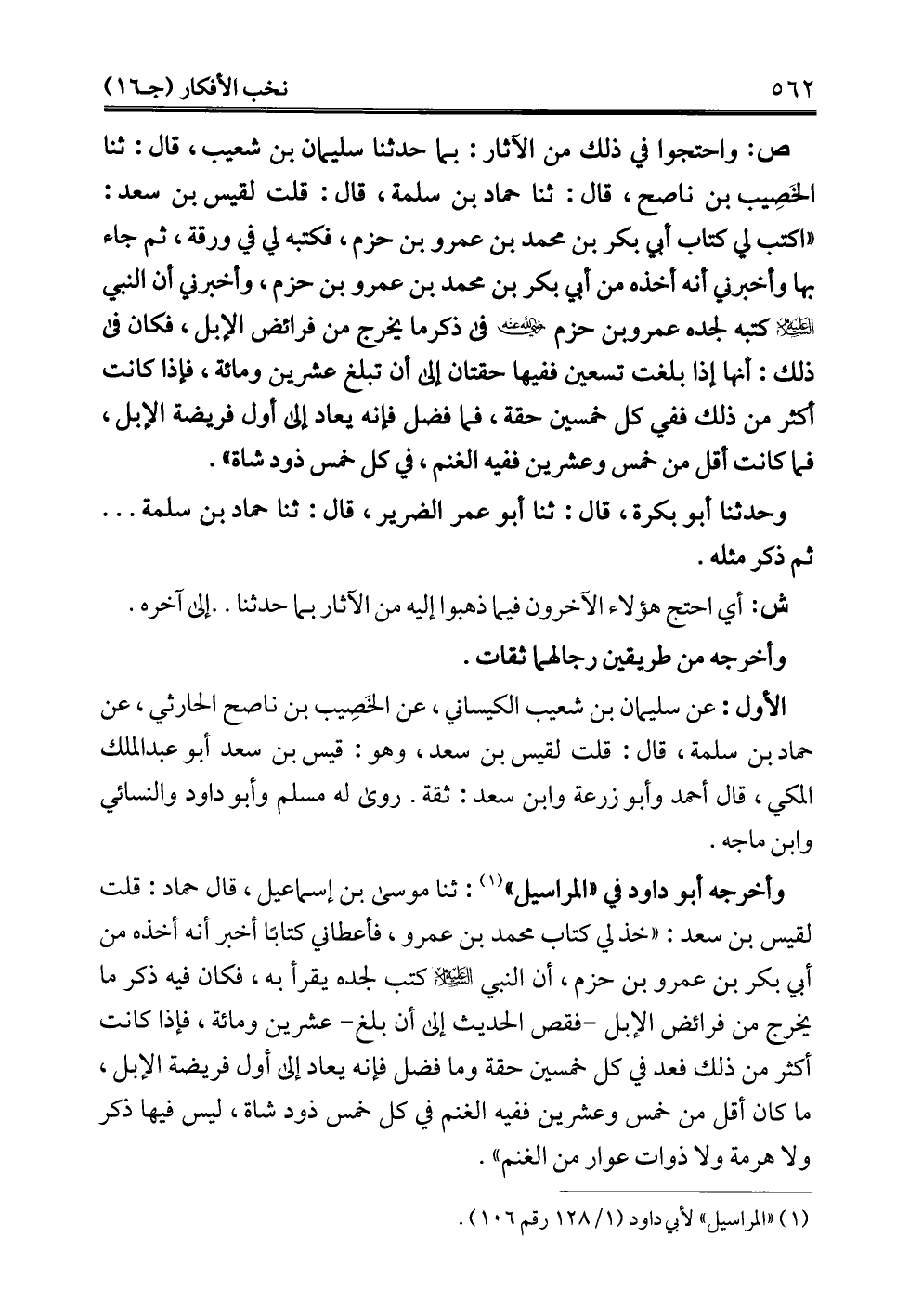 وأخرجه أبو داود في "المراسيل" (¬1): ثنا موسى بن إسماعيل، قال حماد: قلت لقيس بن سعد: "خذ لي كتاب محمَّد بن عمرو، فأعطاني كتابًا أخبر أنه أخذه من أبي بكر بن عمرو بن حزم، أن النبي -عليه السلام- كتب لجده يقرأ به، فكان فيه ذكر ما يخرج من فرائض الإبل -فقص الحديث إلى أن بلغ- عشرين ومائة، فإذا كانت أكثر من ذلك فعد في كل خمسين حقة وما فضل فإنه يعاد إلى أول فريضة الإبل، ما كان أقل من خمس وعشرين ففيه الغنم في كل خمس ذود شاة، ليس فيها ذكر ولا هرمة ولا ذوات عوار من الغنم".