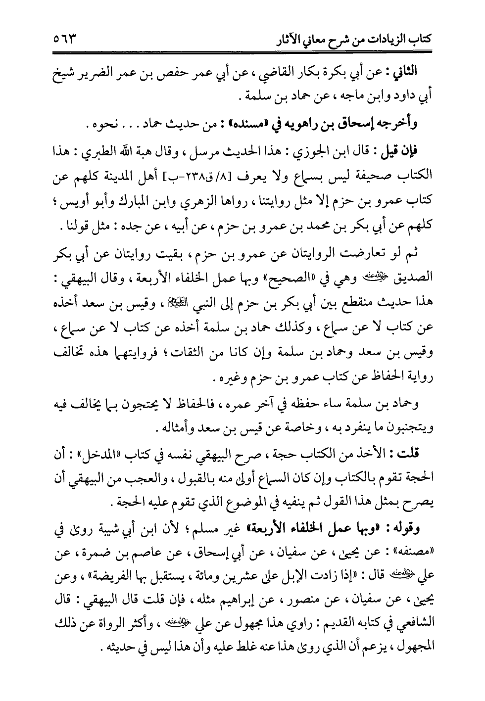 ثم لو تعارضت الروايتان عن عمرو بن حزم، بقيت روايتان عن أبي بكر الصديق - رضي الله عنه - وهي في "الصحيح" وبها عمل الخلفاء الأربعة، وقال البيهقي: هذا حديث منقطع بين أبي بكر بن حزم إلى النبي -عليه السلام-، وقيس بن سعد أخذه عن كتاب لا عن سماع، وكذلك حماد بن سلمة أخذه عن كتاب لا عن سماع، وقيس بن سعد وحماد بن سلمة وإن كانا من الثقات؛ فروايتهما هذه تخالف رواية الحفاظ عن كتاب عمرو بن حزم وغيره.