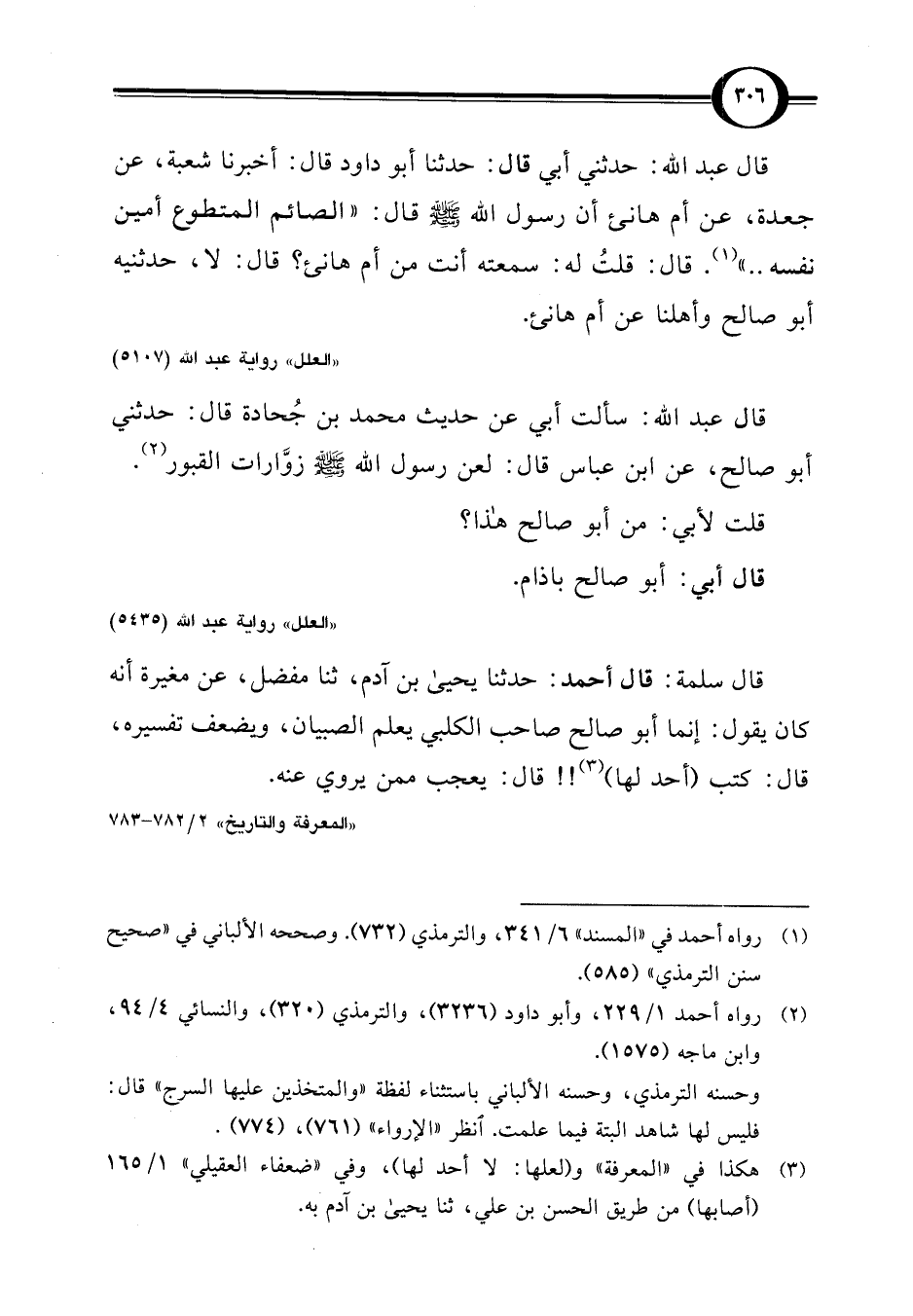 قال سلمة: قال أحمد: حدثنا يحيى بن آدم، ثنا مفضل، عن مغيرة أنه كان يقول: إنما أبو صالح صاحب الكلبي يعلم الصبيان، ويضعف تفسيره، قال: كتب (أحد لها) (¬3)! ! قال: يعجب ممن يروي عنه.