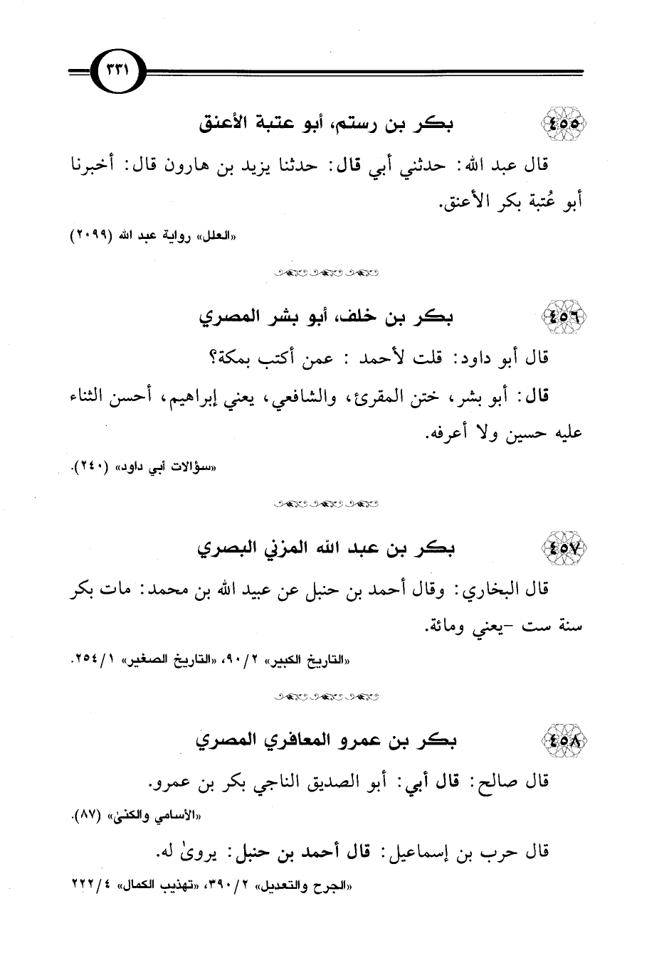 قال عبد اللَّه: حدثني أبي قال: حدثنا يزيد بن هارون قال: أخبرنا أبو عُتبة بكر الأعنق.